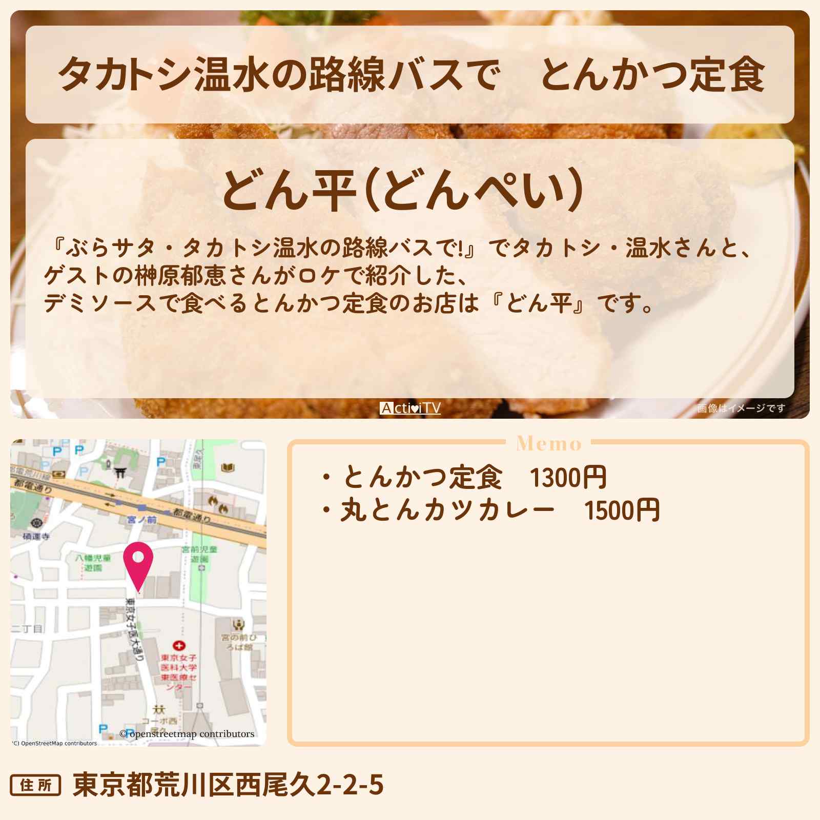 とんかつと酒鍋の店 どん平は、昭和36年創業のとんかつ屋。とんかつは豚バラ肉を、しょうが・ネギ・日本酒・オカラで6時間に煮込んだデミグラスソース・とんかつソースをかけて頂くトロトロの角煮のような食感が特徴です。酒鍋は鍋に日本酒を入れ、火を点けてアルコールをとばし、まずはしゃぶしゃぶ。だし汁を入れ、鍋を堪能した後に、雑炊が楽しめます。…