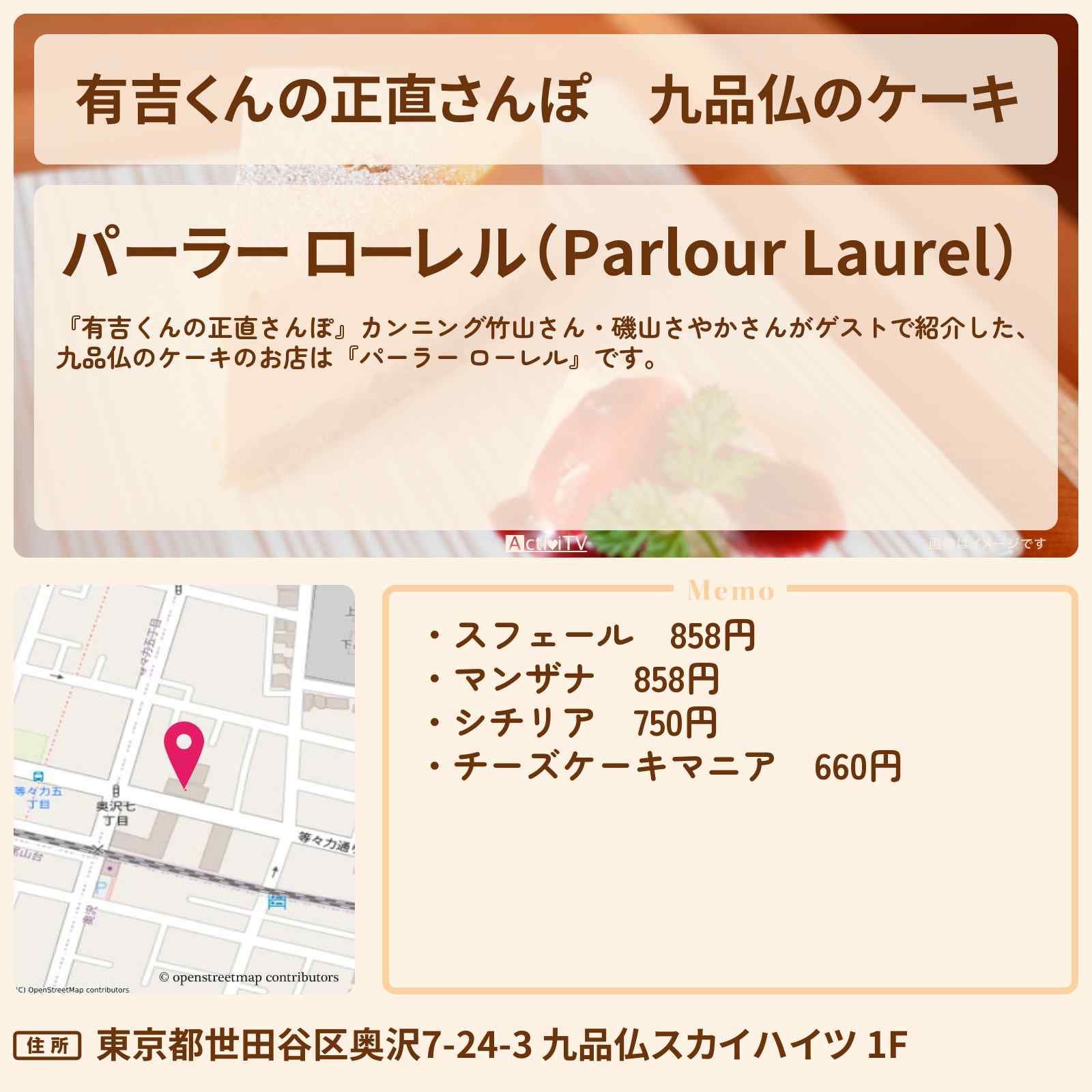 | 住所 | 東京都世田谷区奥沢7-24-3 九品仏スカイハイツ 1F |