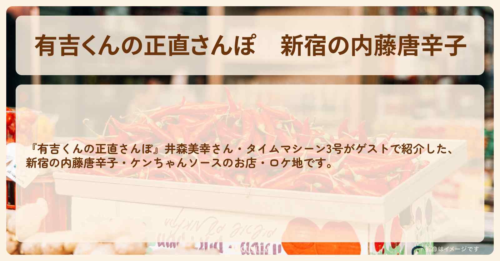 放送の【有吉くんの正直さんぽ】井森美幸さん・タイムマシーン3号がゲストで紹介した、新宿の内藤唐辛子・ケンちゃんソースのお店・ロケ地です。
