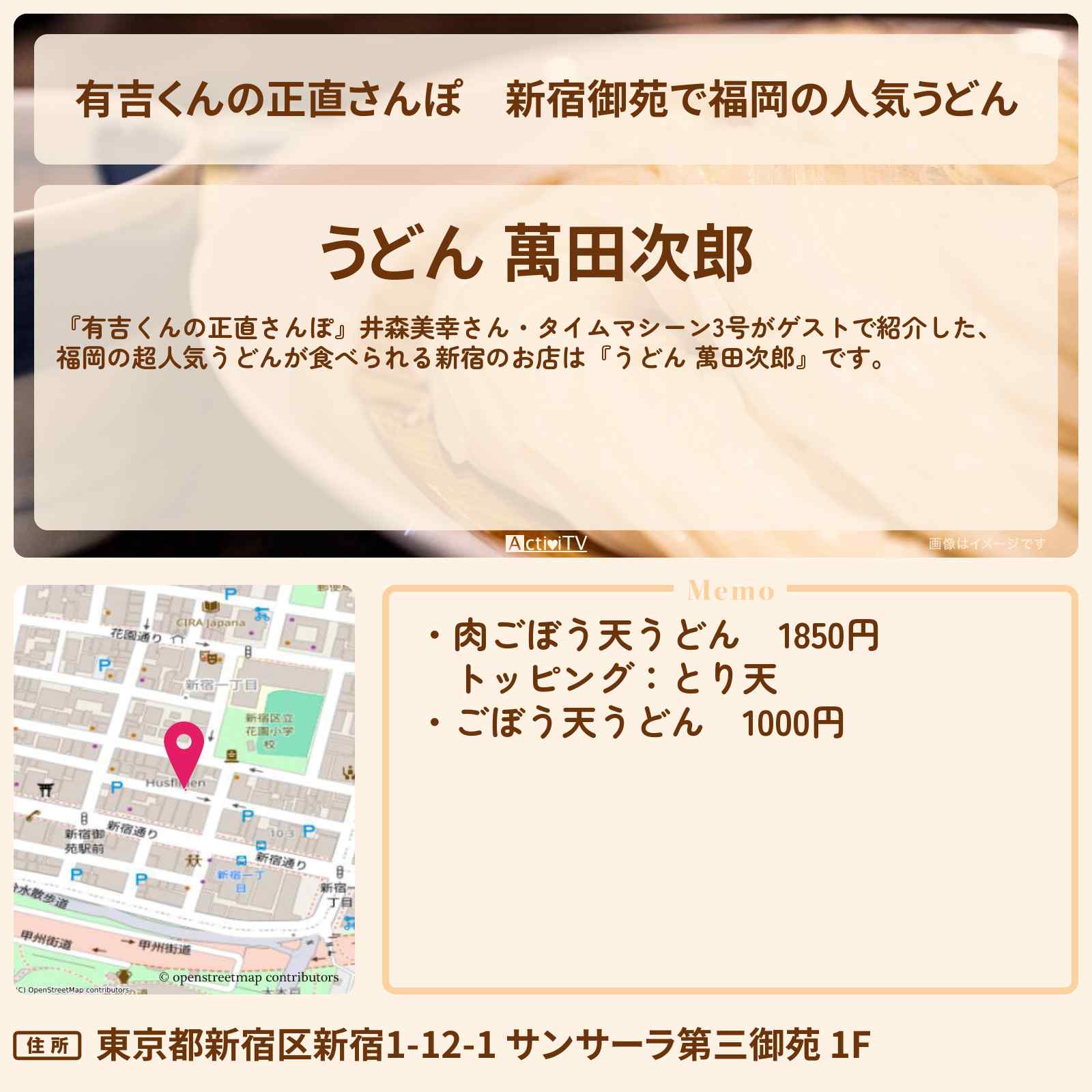 放送の【有吉くんの正直さんぽ】井森美幸さん・タイムマシーン3号がゲストで紹介した、福岡の超人気うどんが食べられる新宿のお店は『うどん 萬田次郎』です。