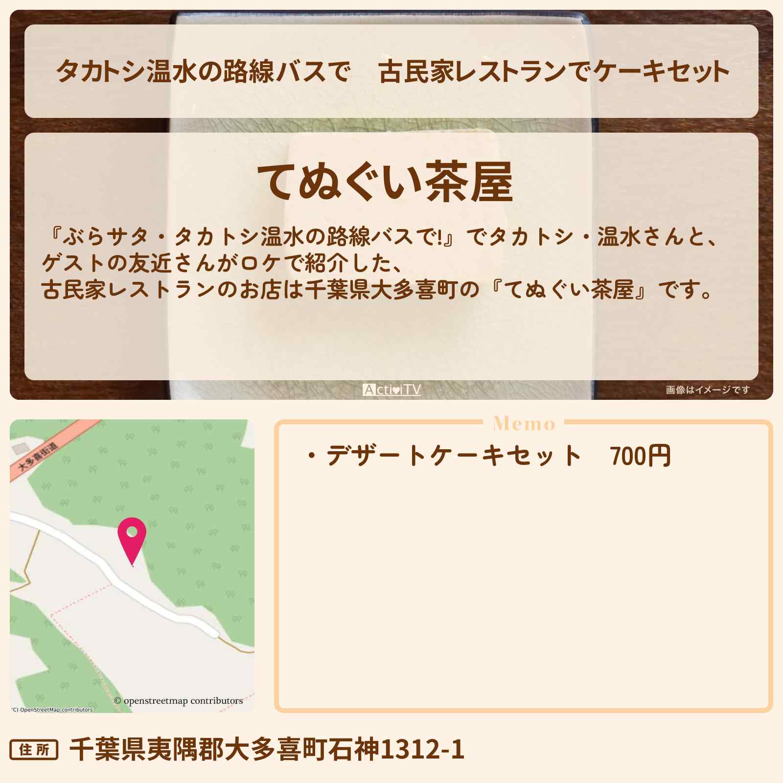 放送の【ぶらサタ・タカトシ温水の路線バスで!】でタカトシ・温水さんと、ゲストの友近さんがロケで紹介した、古民家レストランのお店は千葉県大多喜町の『てぬぐい茶屋』です。