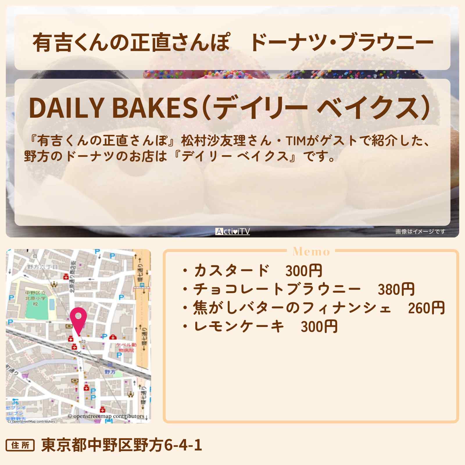 放送の【有吉くんの正直さんぽ】松村沙友理さん・TIMがゲストで紹介した、野方のドーナツのお店は『デイリー ベイクス』です。
