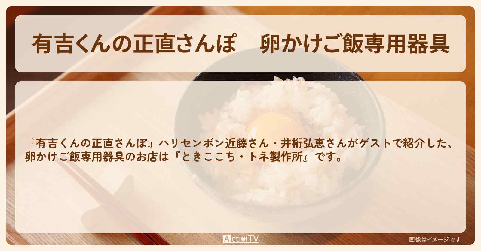 放送の【有吉くんの正直さんぽ】ハリセンボン近藤さん・井桁弘恵さんがゲストで紹介した、卵かけご飯専用器具のお店は『ときここち・トネ製作所』です。