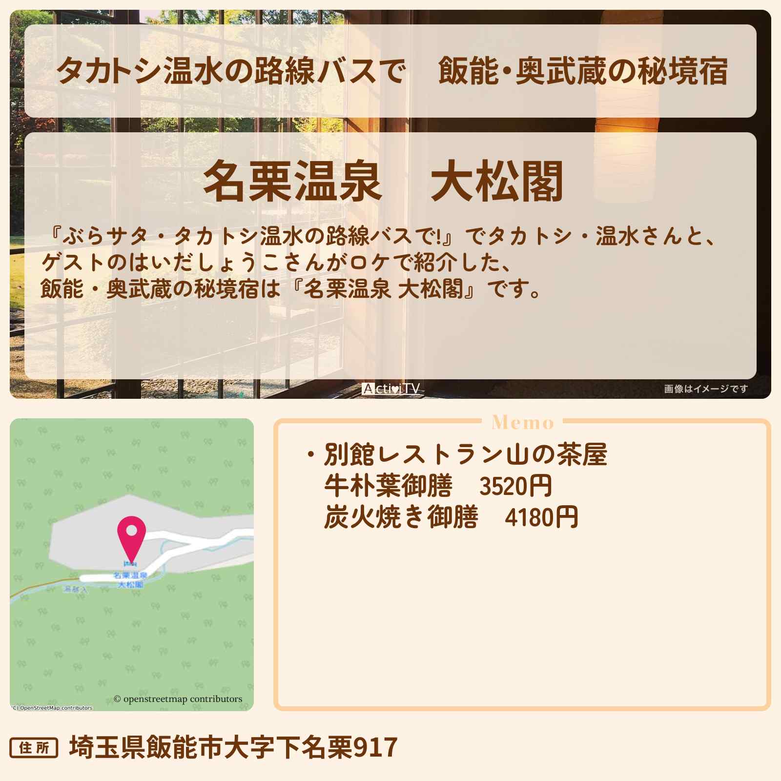 | 住所 | 埼玉県飯能市大字下名栗917 |