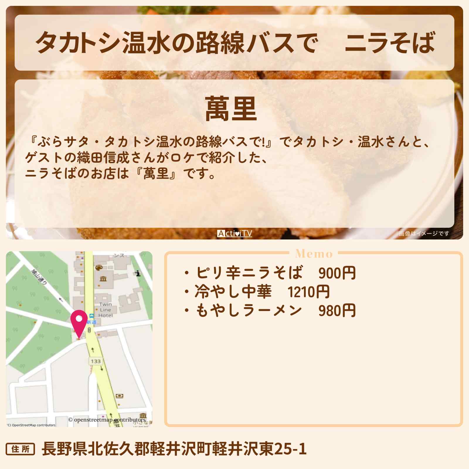 放送の【ぶらサタ・タカトシ温水の路線バスで!】でタカトシ・温水さんと、ゲストの織田信成さんがロケで紹介した、ニラそばのお店は『萬里』です。