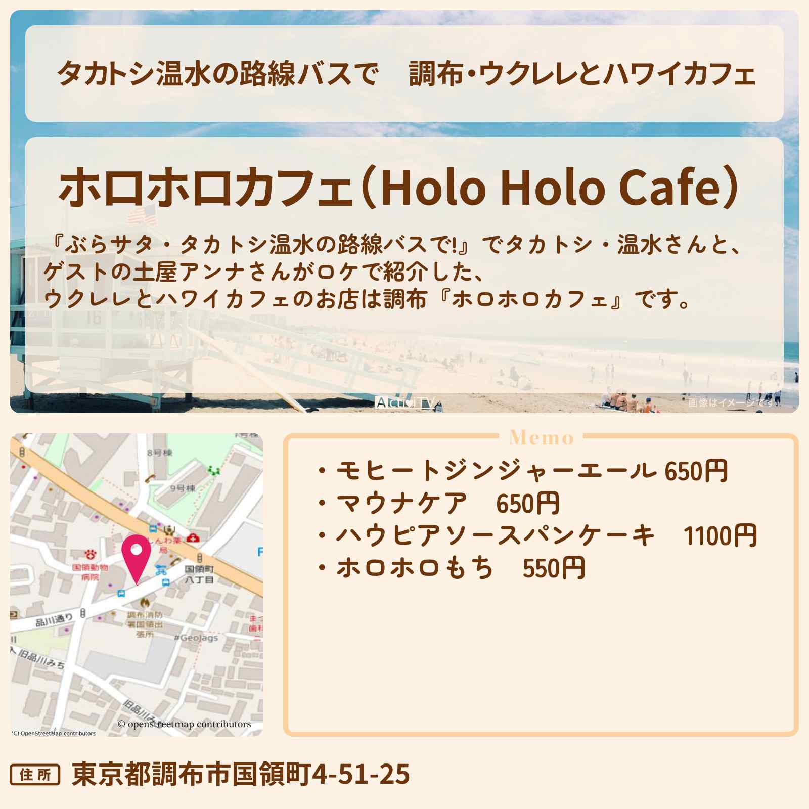 放送の【ぶらサタ・タカトシ温水の路線バスで!】でタカトシ・温水さんと、ゲストの土屋アンナさんがロケで紹介した、ウクレレとハワイカフェのお店は調布『ホロホロカフェ』です。