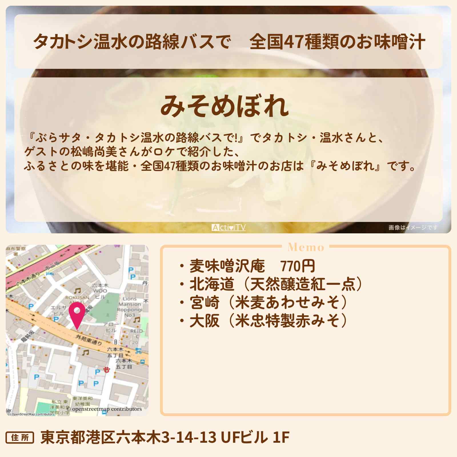 放送の【ぶらサタ・タカトシ温水の路線バスで!】でタカトシ・温水さんと、ゲストの松嶋尚美さんがロケで紹介した、ふるさとの味を堪能・全国47種類のお味噌汁のお店は『みそめぼれ』です。
