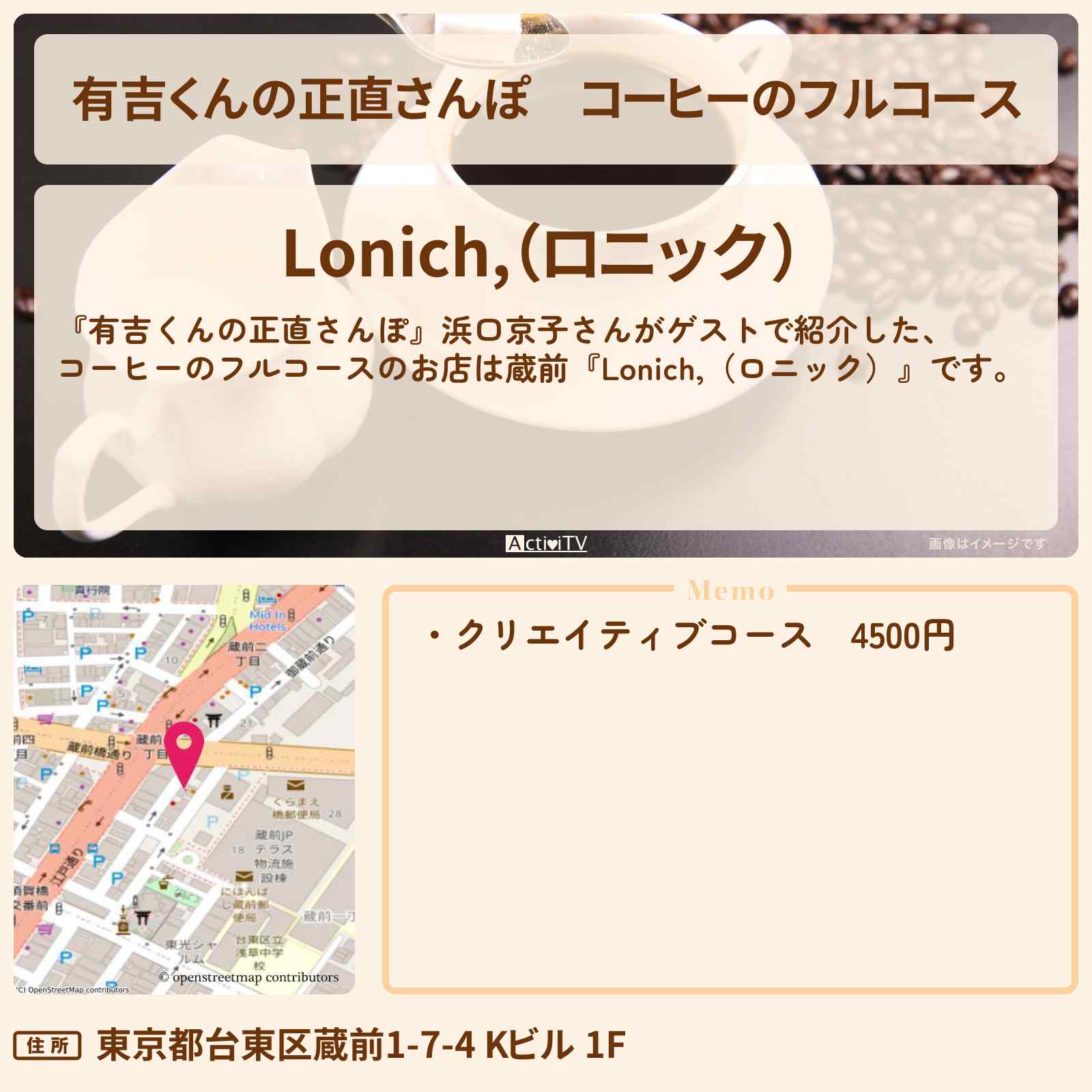 | 住所 | 東京都台東区蔵前1-7-4 Kビル 1F |