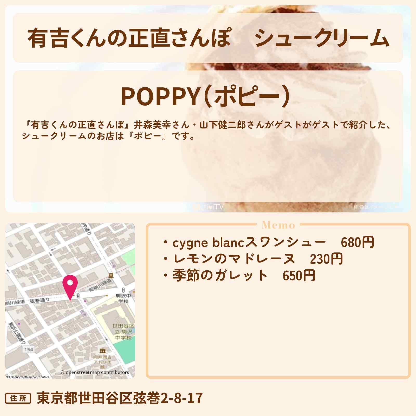 【有吉くんの正直さんぽ】シュークリーム『ポピー』駒沢のお店・ロケ地を紹介〔井森美幸・山下健二郎〕