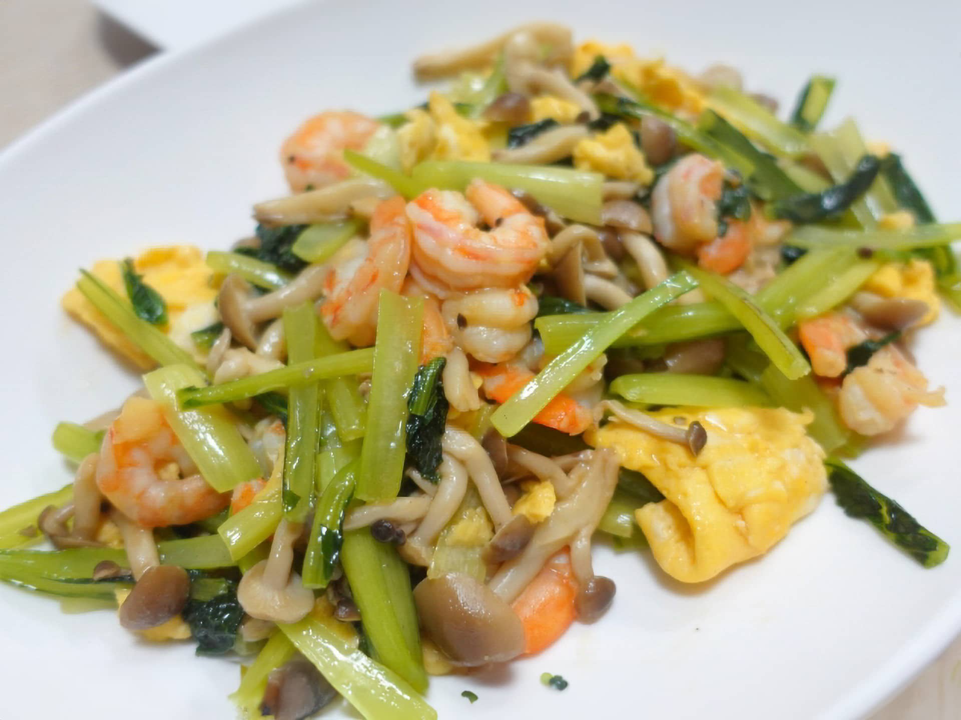 - 小松菜の軸から炒め、炒まったら葉を加えて強火で炒る