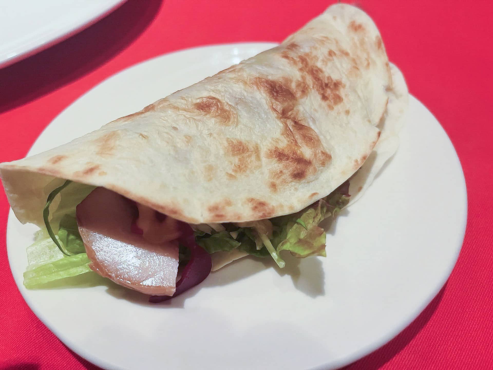 - 焼いた生地の綺麗な面を下にしてサニーレタスと具材をのせて半分に折って完成!