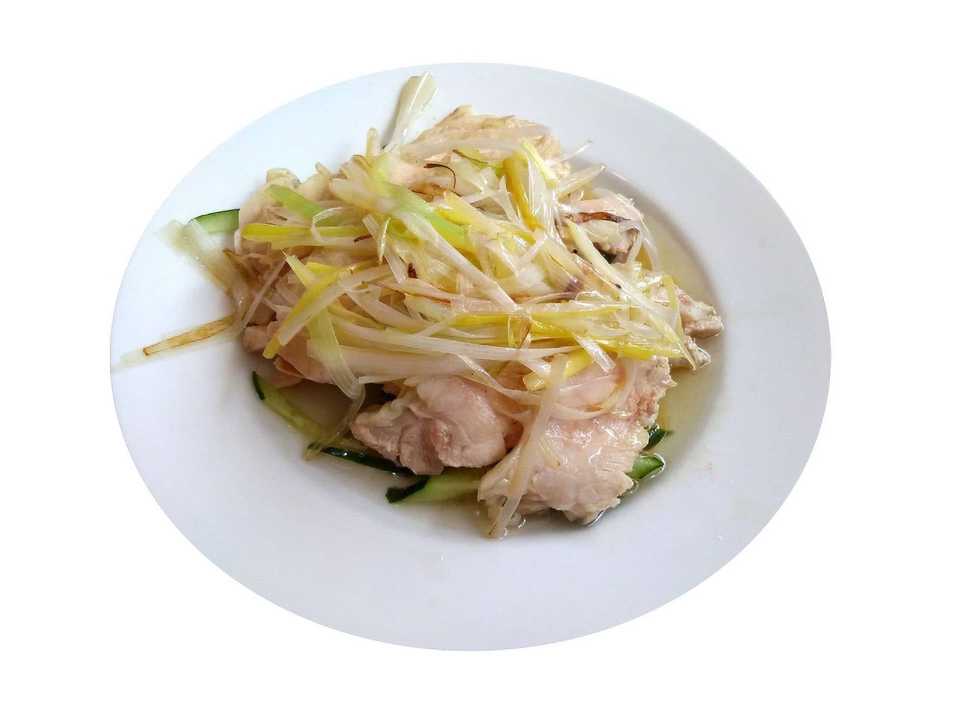 - 皿に青ねぎ、しょうがの細切りを入れて混ぜ、鶏肉をのせ、<味つけ調味料>を上からかける