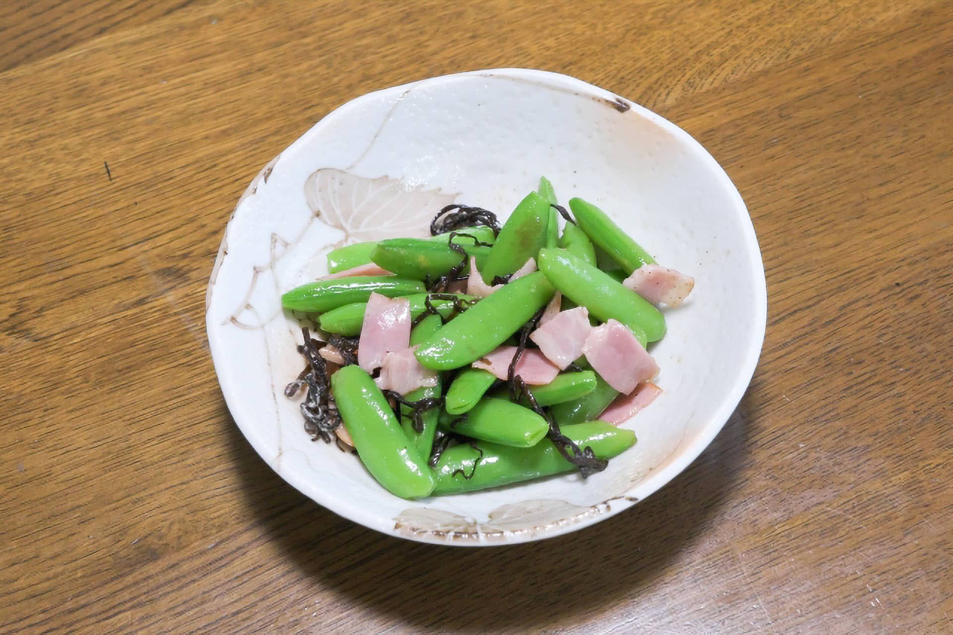 ベーコン 5mm幅に切る - 熱湯に約1%の塩を入れてスナップエンドウ・ブロッコリーを1分ゆで、アスパラガスを加えて更に2分ゆでる