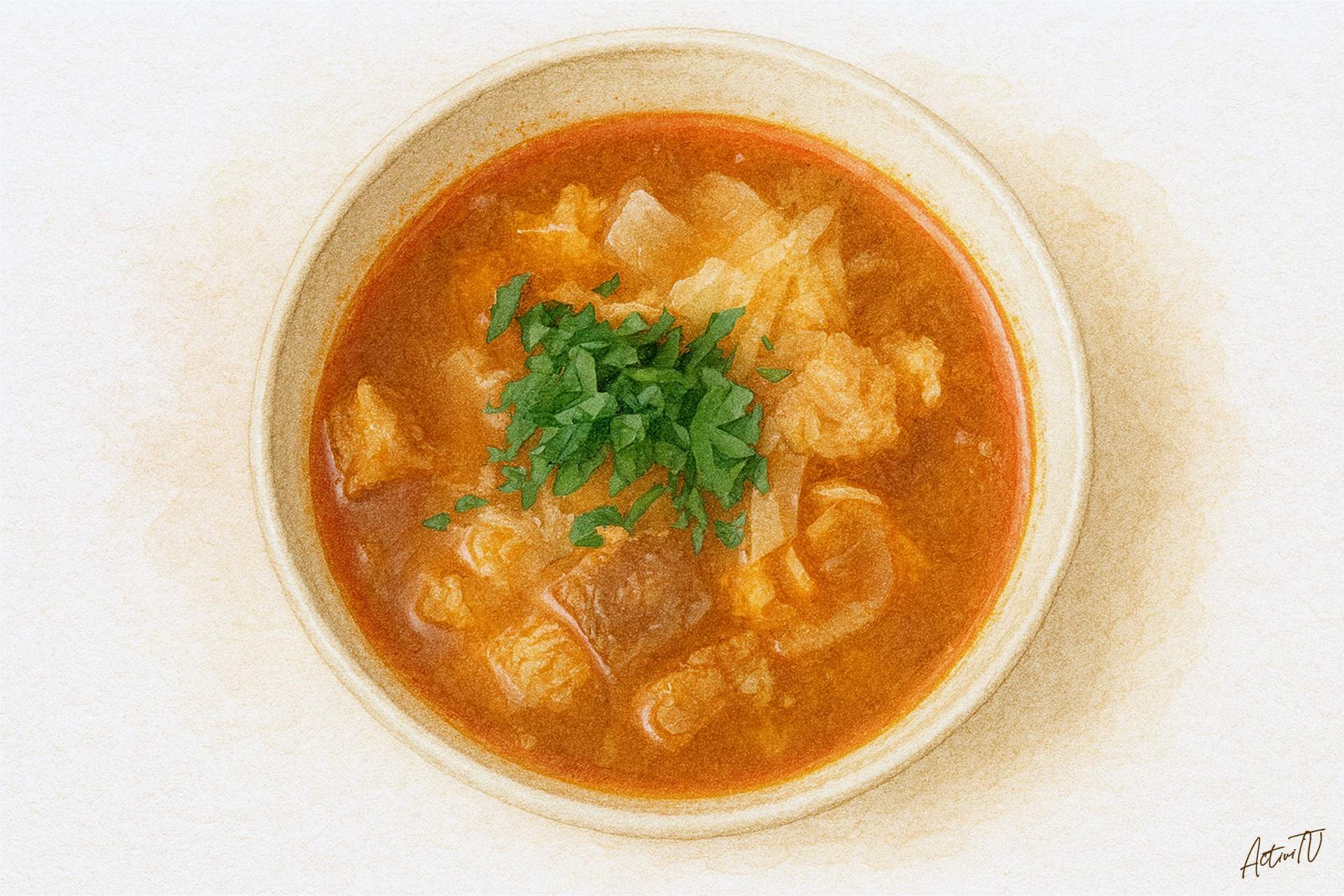 しょうがの辛みと香りを主役に、にんにくとパプリカのコクを重ねたピリうまスープ。玉ねぎの甘みとマッシュルームのうま味、ベーコンの塩気が合わさり、ひと口ごとに深みが広がる。角切りバゲットを一緒に煮ることでとろみと満足感が生まれ、食べるスープのような仕上がりに。