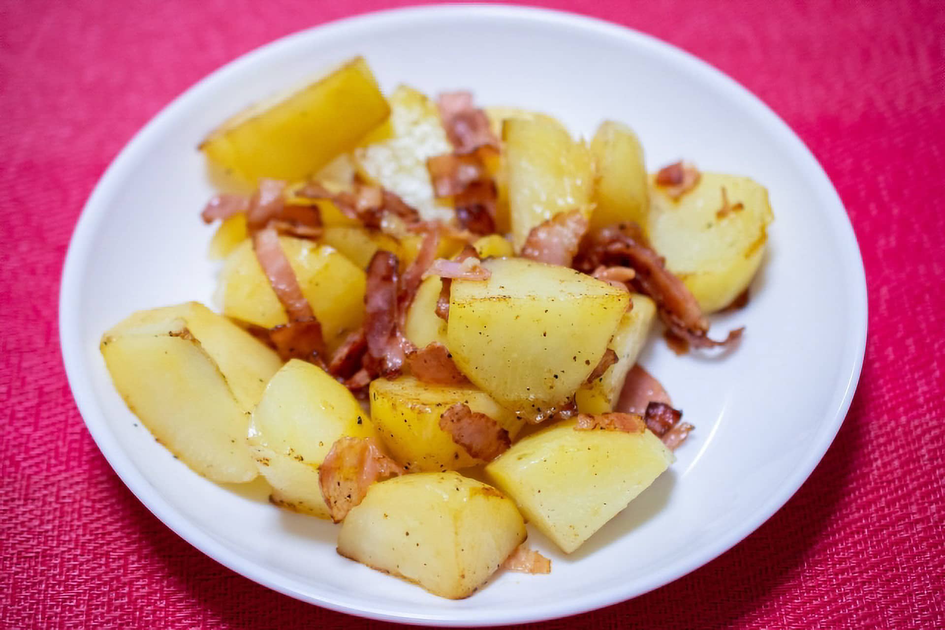 - フライパンにサラダ油を熱してじゃがいも・ベーコンを入れ、中火でこんがり焼き色をつける