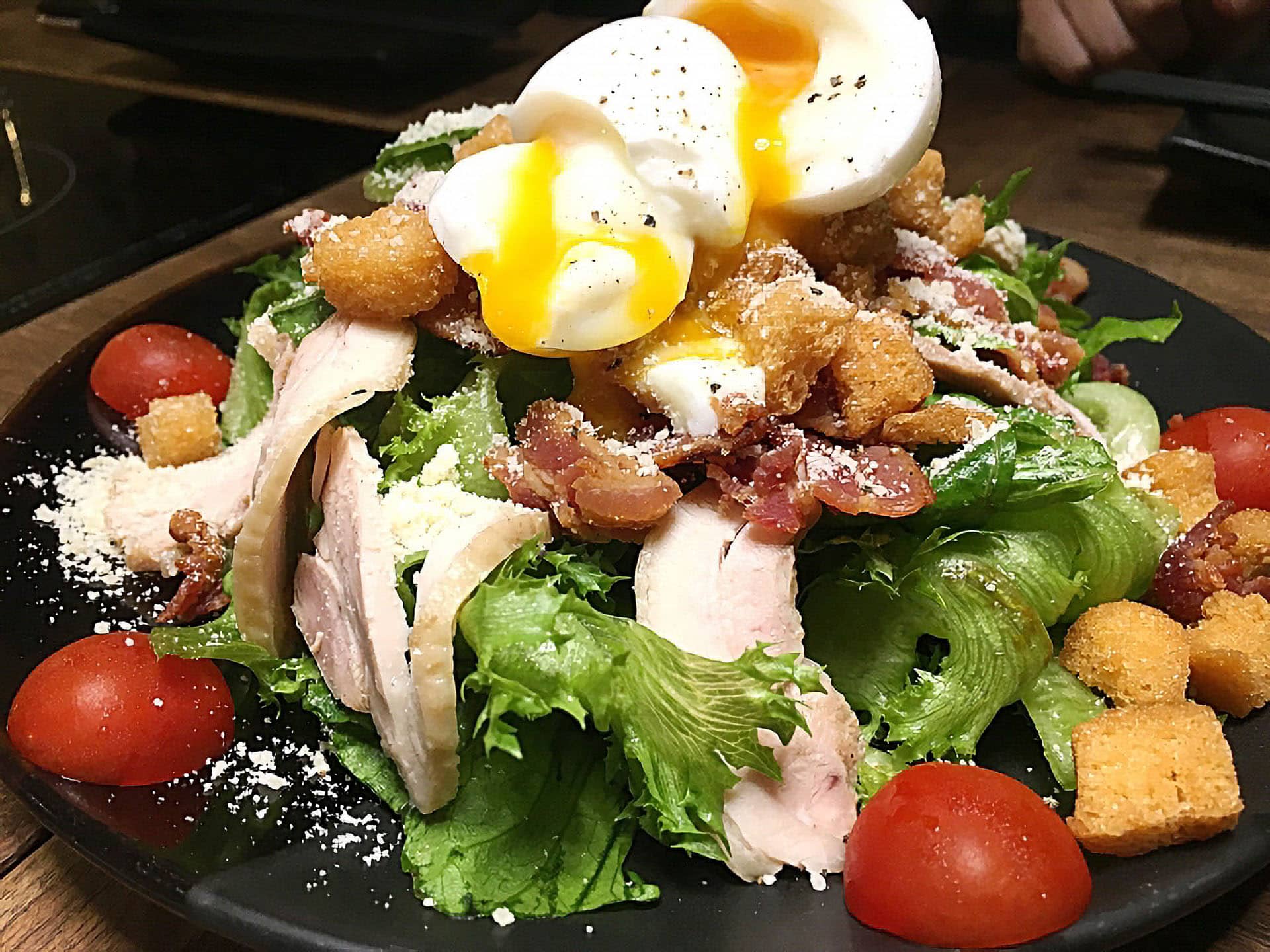 新鮮なサニーレタスとグリーンリーフ、ジューシーなトマト、そして鶏胸肉を使った、食べ応えのあるサラダです。ドレッシングには温泉卵とレモン汁が加わり、まろやかでさっぱりとした風味が特徴です。カレー粉でマリネした鶏胸肉が、シーザーサラダにスパイシーなアクセントを加え、パルメザンチーズのコクが全体を引き立てます。