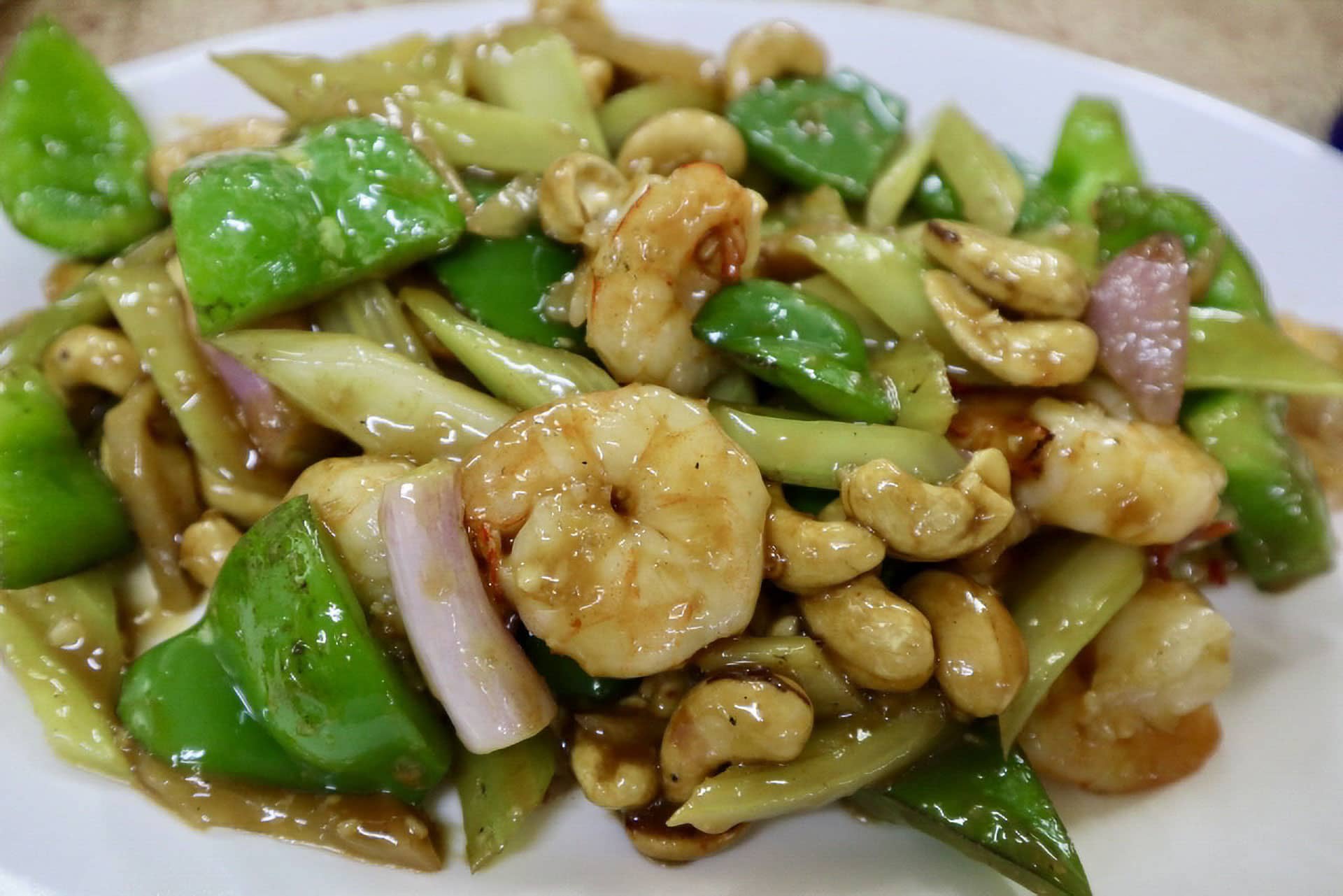 - セロリの茎を加えて炒め、透明感が出たらえびを戻し入れてサッと炒る