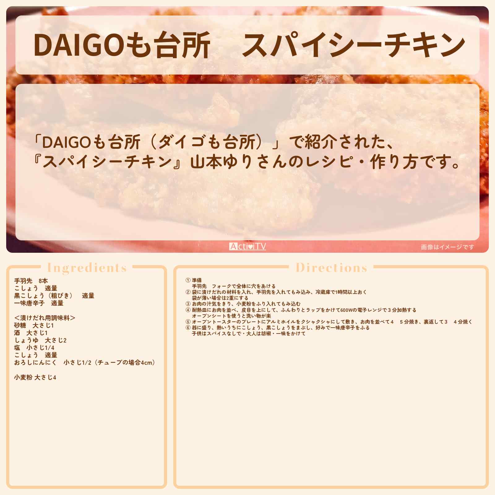 放送の「DAIGOも台所(ダイゴも台所)」で紹介された、『スパイシーチキン』山本ゆりさんのレシピ・作り方です。