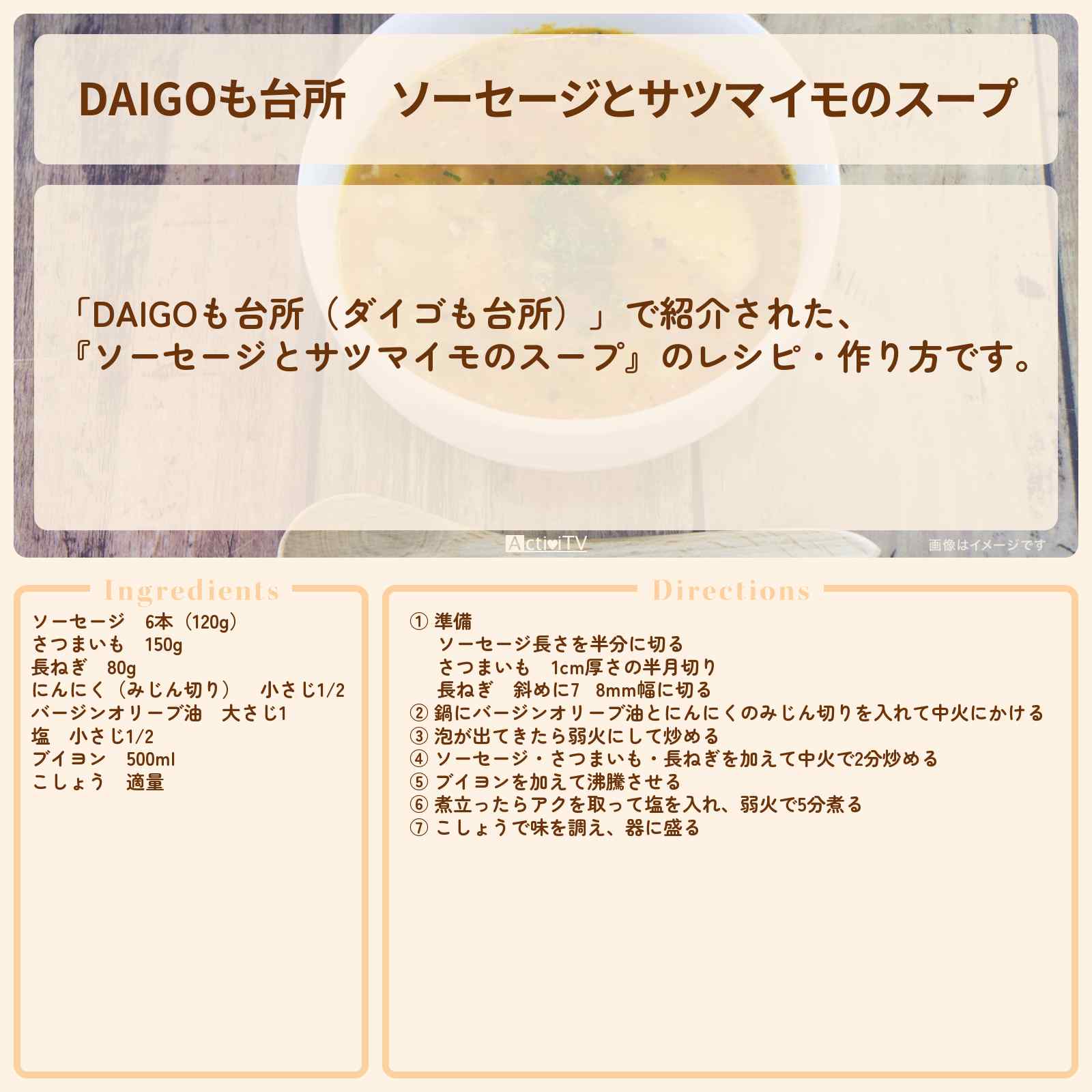 放送の【DAIGOも台所(ダイゴも台所)】で紹介された、『ソーセージとサツマイモのスープ』のレシピ・作り方です。
