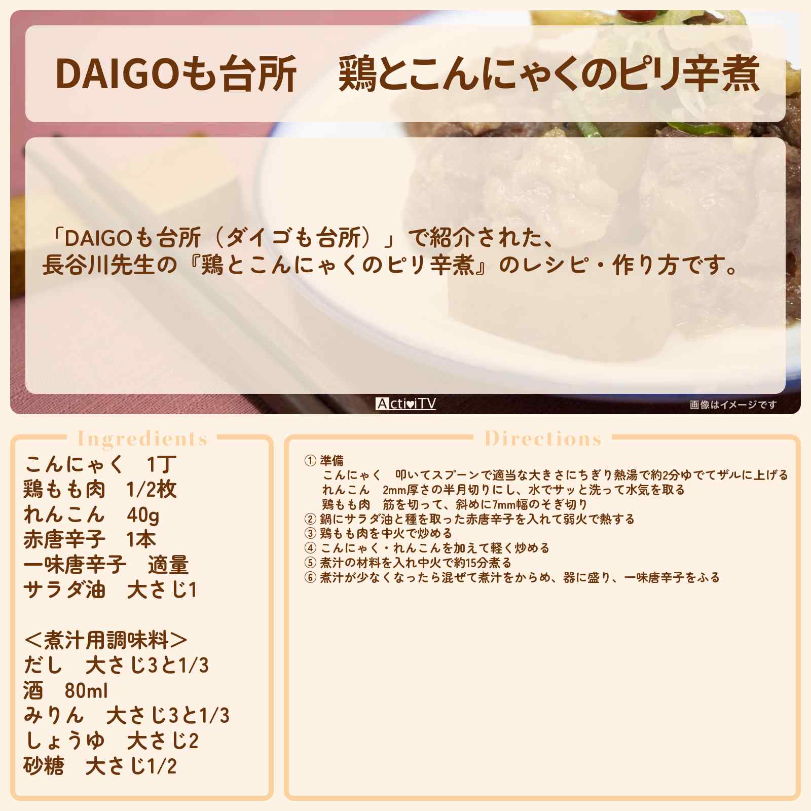 放送の「DAIGOも台所(ダイゴも台所)」で紹介された、長谷川先生の『鶏とこんにゃくのピリ辛煮』のレシピ・作り方です。