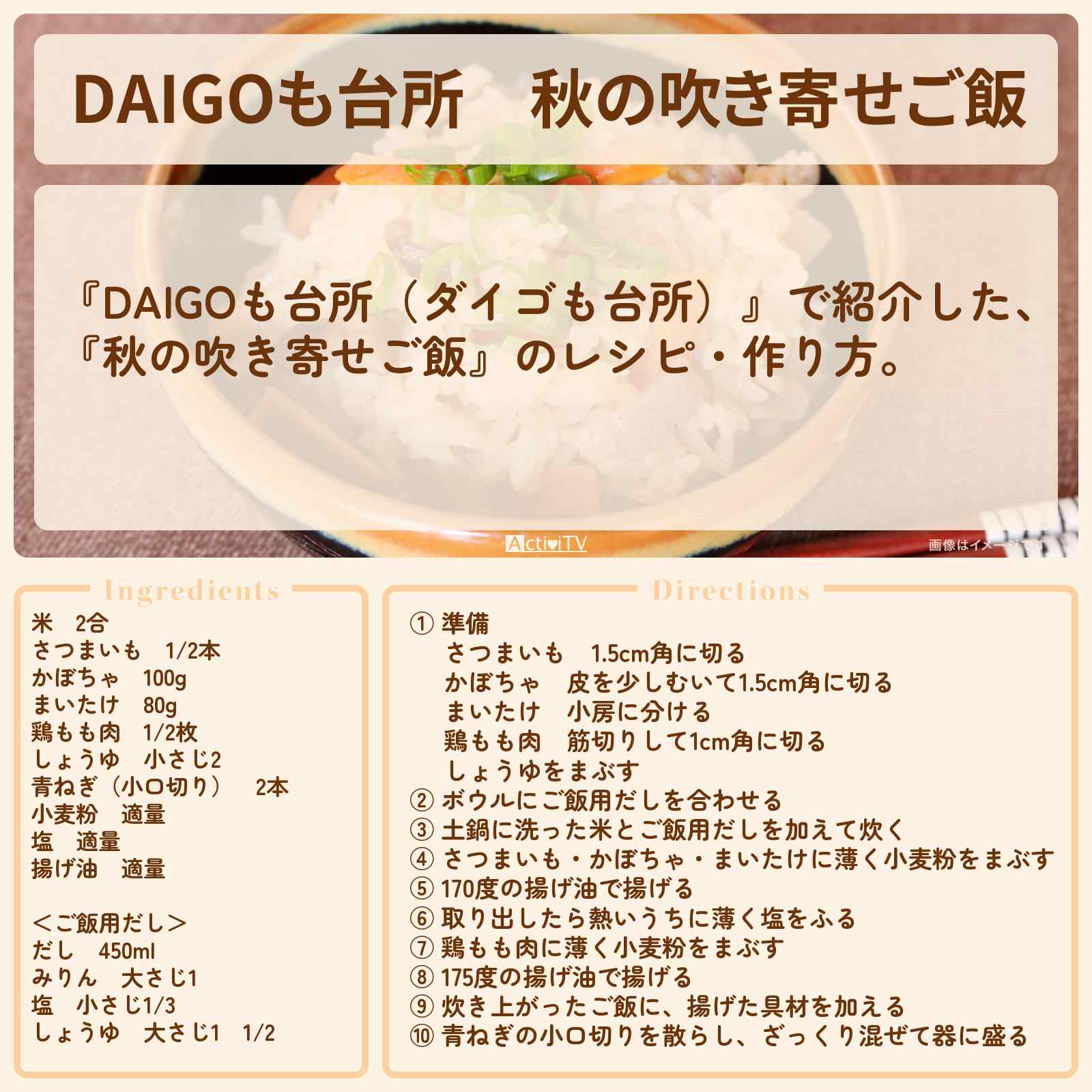 放送の【DAIGOも台所(ダイゴも台所)】で紹介した、『秋の吹き寄せご飯』のレシピ・作り方。
