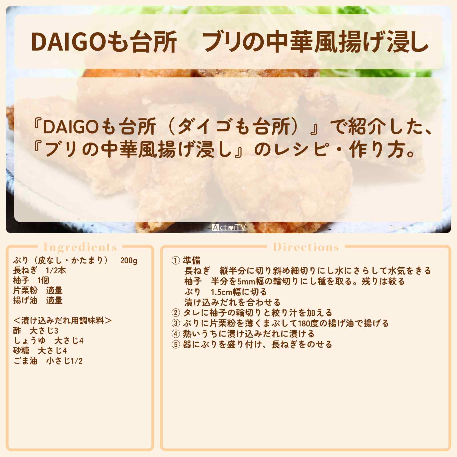放送の【DAIGOも台所(ダイゴも台所)】で紹介した、『ブリの中華風揚げ浸し』のレシピ・作り方。