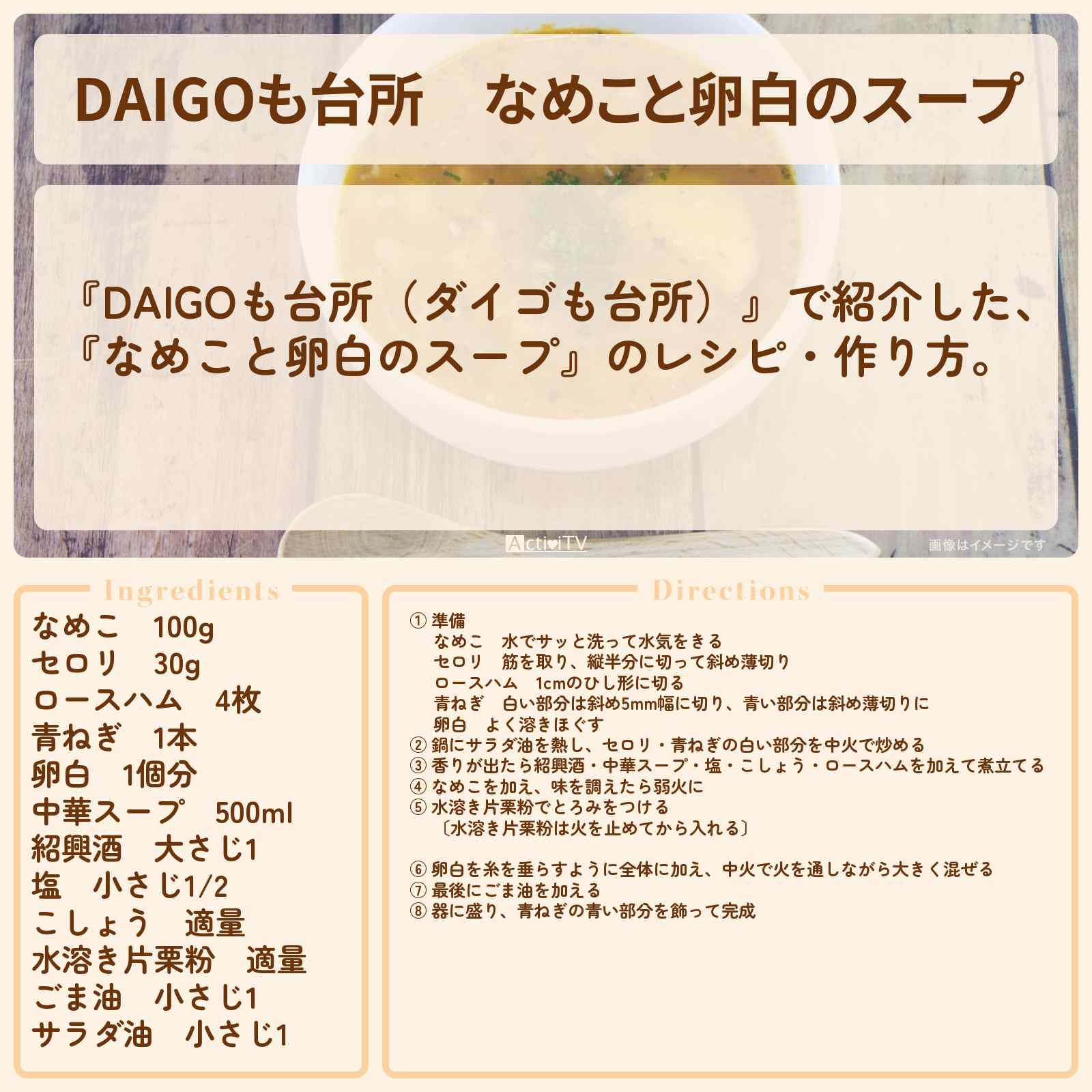 放送の【DAIGOも台所(ダイゴも台所)】で紹介した、『なめこと卵白のスープ』のレシピ・作り方。