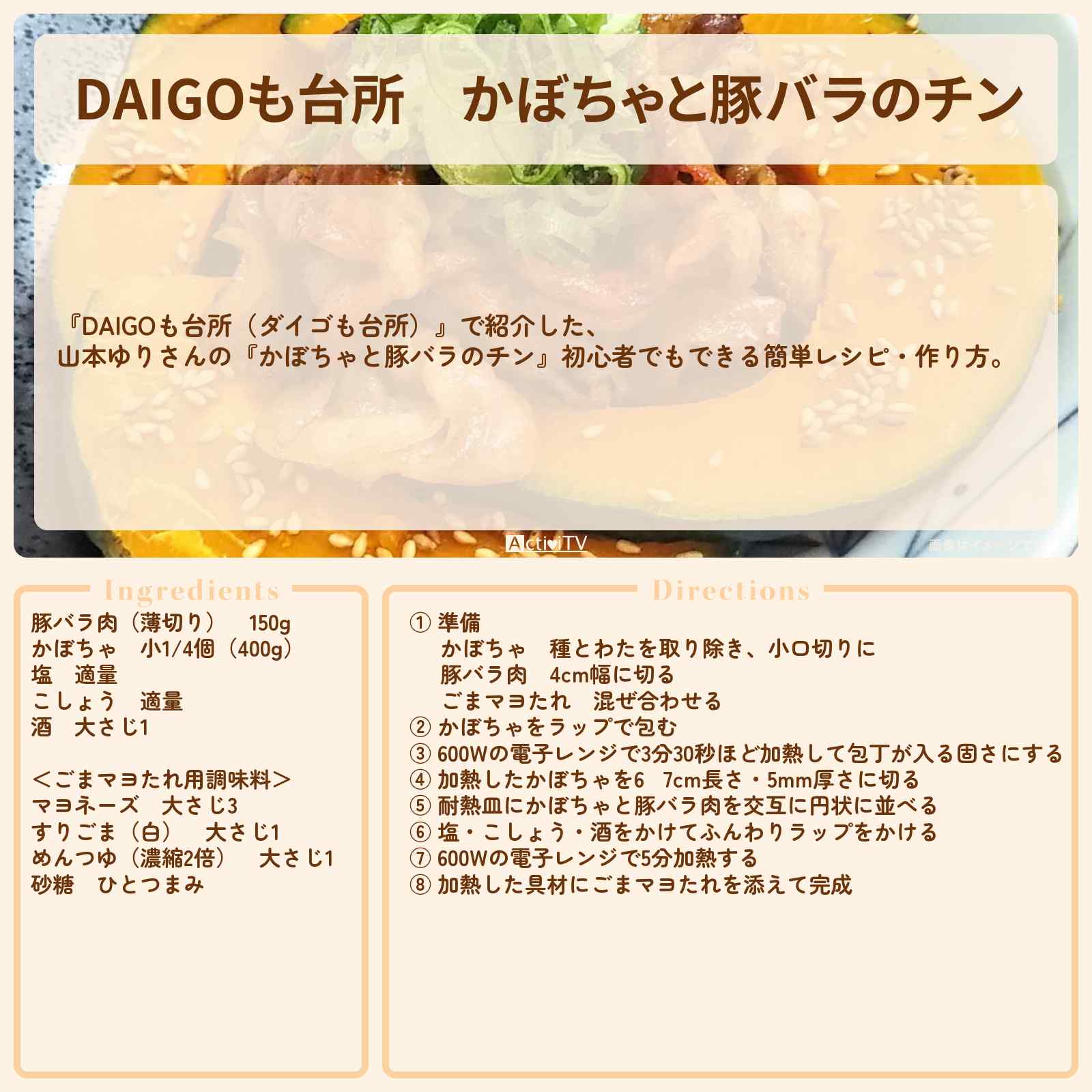 放送の【DAIGOも台所(ダイゴも台所)】で紹介した、山本ゆりさんの『かぼちゃと豚バラのチン』初心者でもできる簡単レシピ・作り方。