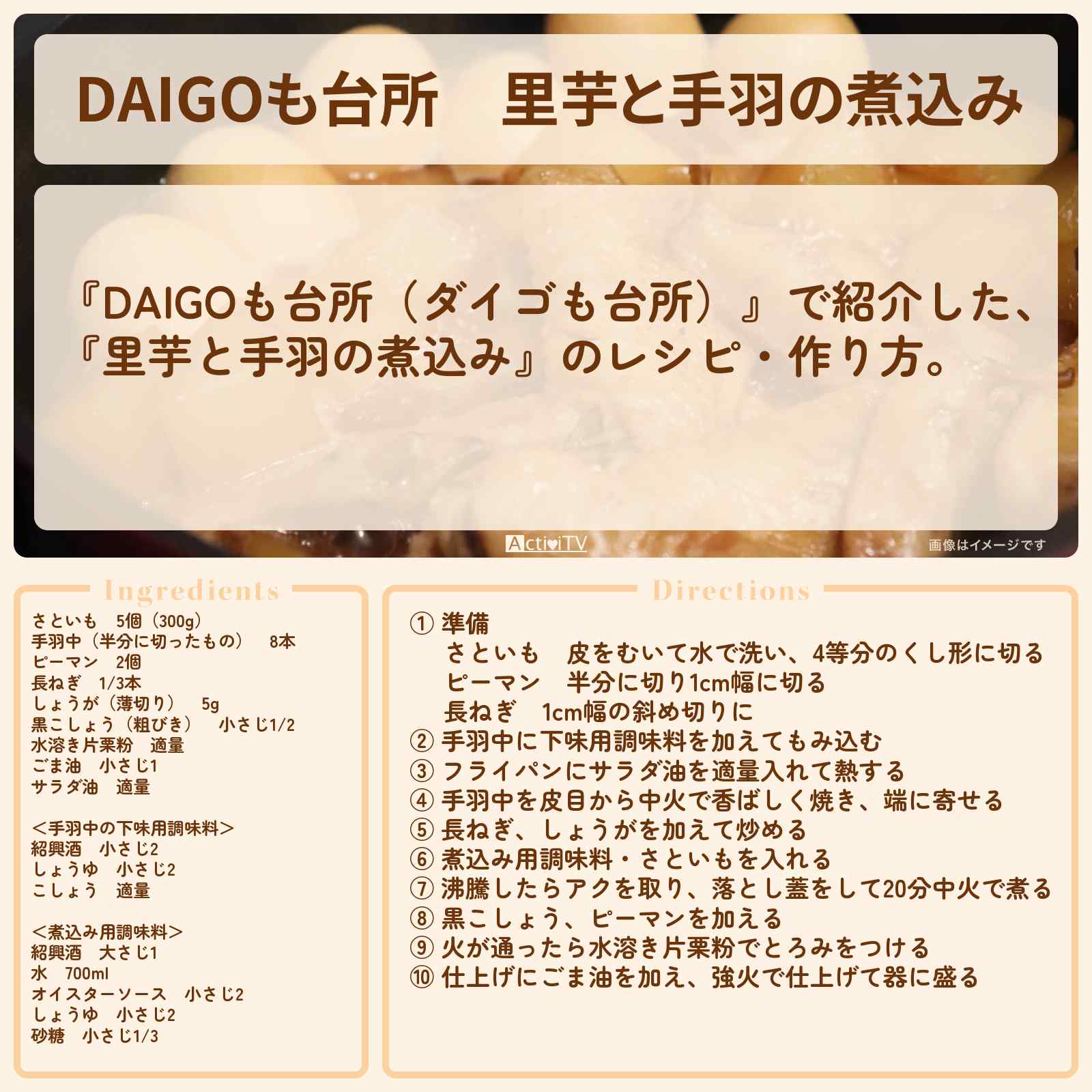 放送の【DAIGOも台所(ダイゴも台所)】で紹介した、『里芋と手羽の煮込み』のレシピ・作り方。