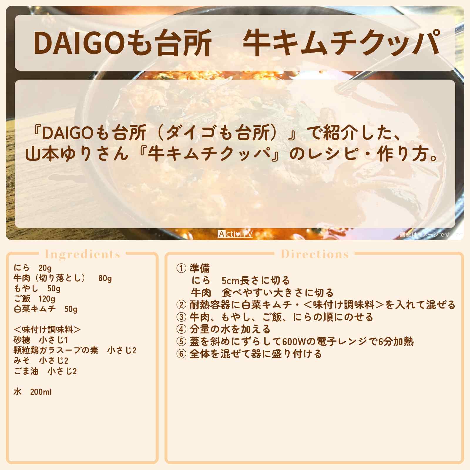 放送の【DAIGOも台所(ダイゴも台所)】で紹介した、山本ゆりさん『牛キムチクッパ』のレシピ・作り方。