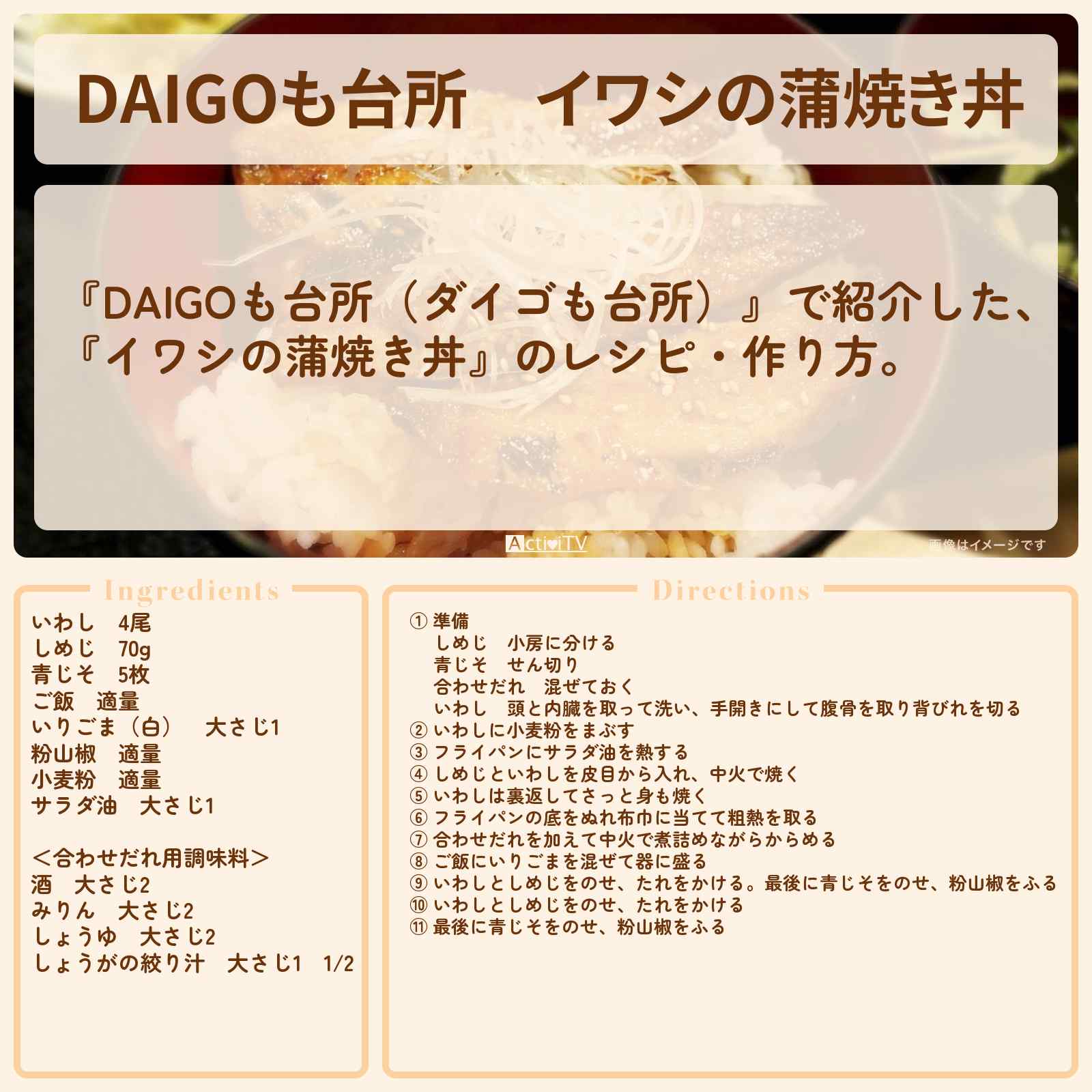 放送の【DAIGOも台所(ダイゴも台所)】で紹介した、『イワシの蒲焼き丼』のレシピ・作り方。
