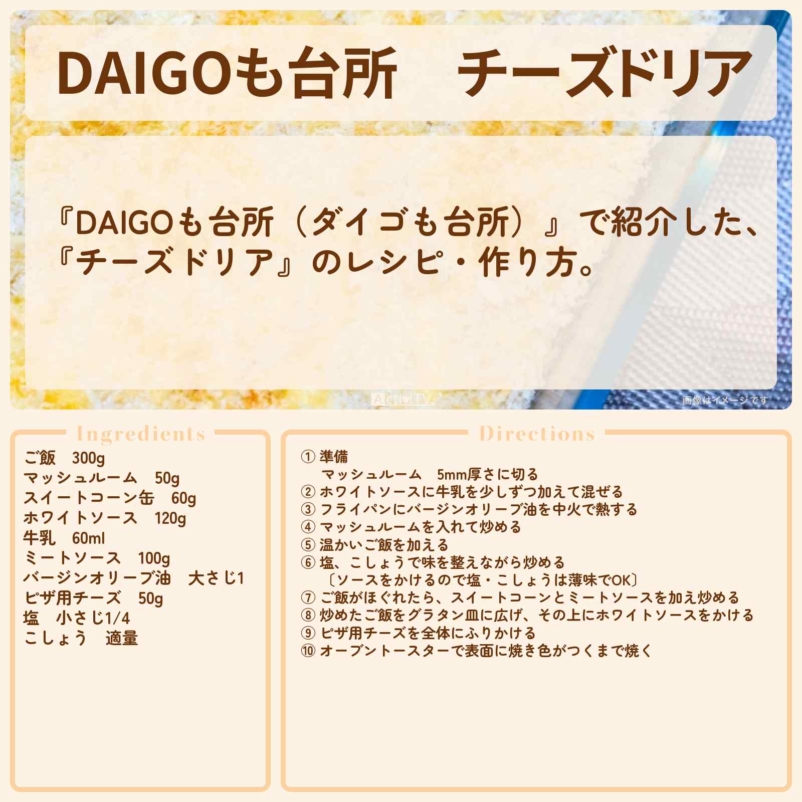 放送の【DAIGOも台所(ダイゴも台所)】で紹介した、『チーズドリア』のレシピ・作り方。