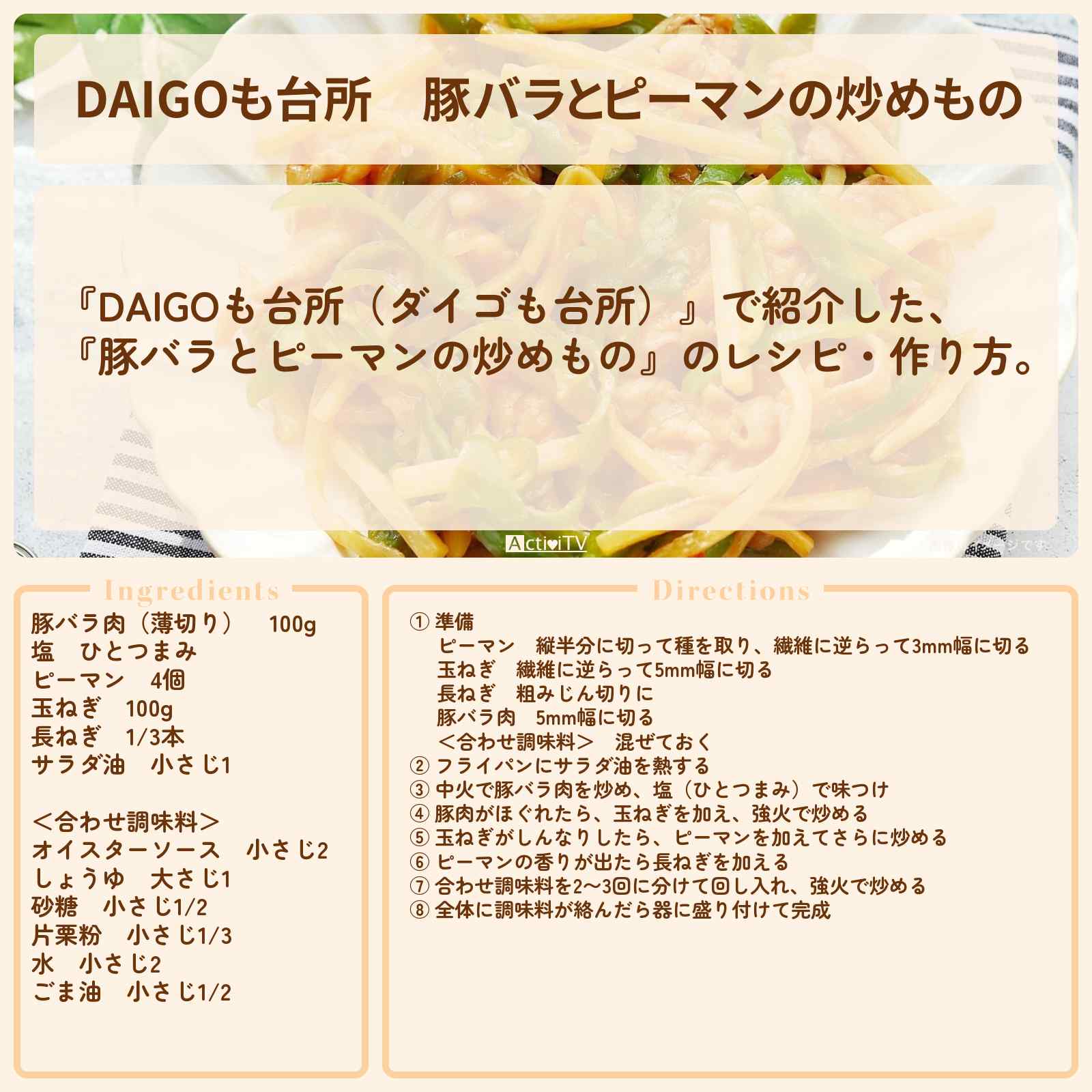 放送の【DAIGOも台所(ダイゴも台所)】で紹介した、『豚バラとピーマンの炒めもの』のレシピ・作り方。