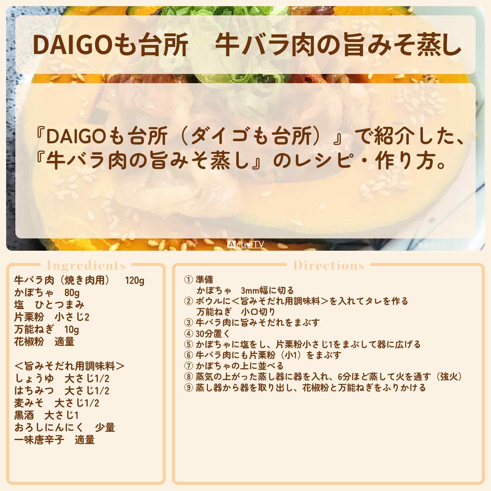 放送の【DAIGOも台所(ダイゴも台所)】で紹介した、『牛バラ肉の旨みそ蒸し』のレシピ・作り方。