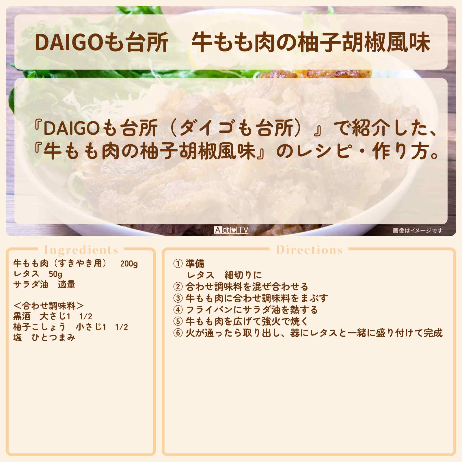 放送の【DAIGOも台所(ダイゴも台所)】で紹介した、『牛もも肉の柚子胡椒風味』のレシピ・作り方。