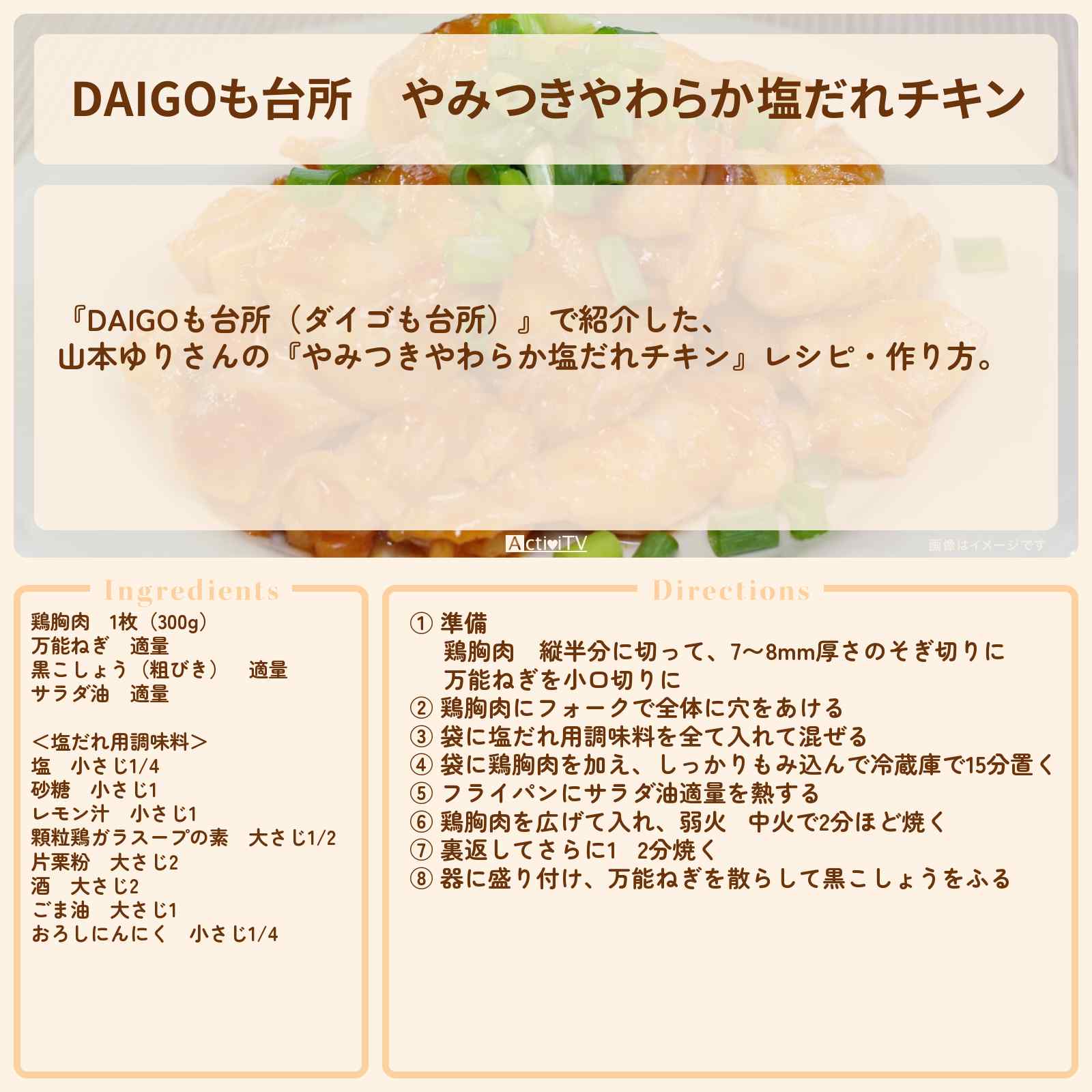 放送の【DAIGOも台所(ダイゴも台所)】で紹介した、山本ゆりさんの『やみつきやわらか塩だれチキン』レシピ・作り方。