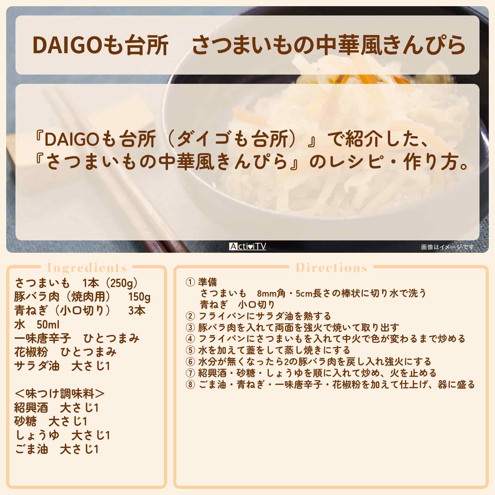 放送の【DAIGOも台所(ダイゴも台所)】で紹介した、『さつまいもの中華風きんぴら』のレシピ・作り方。
