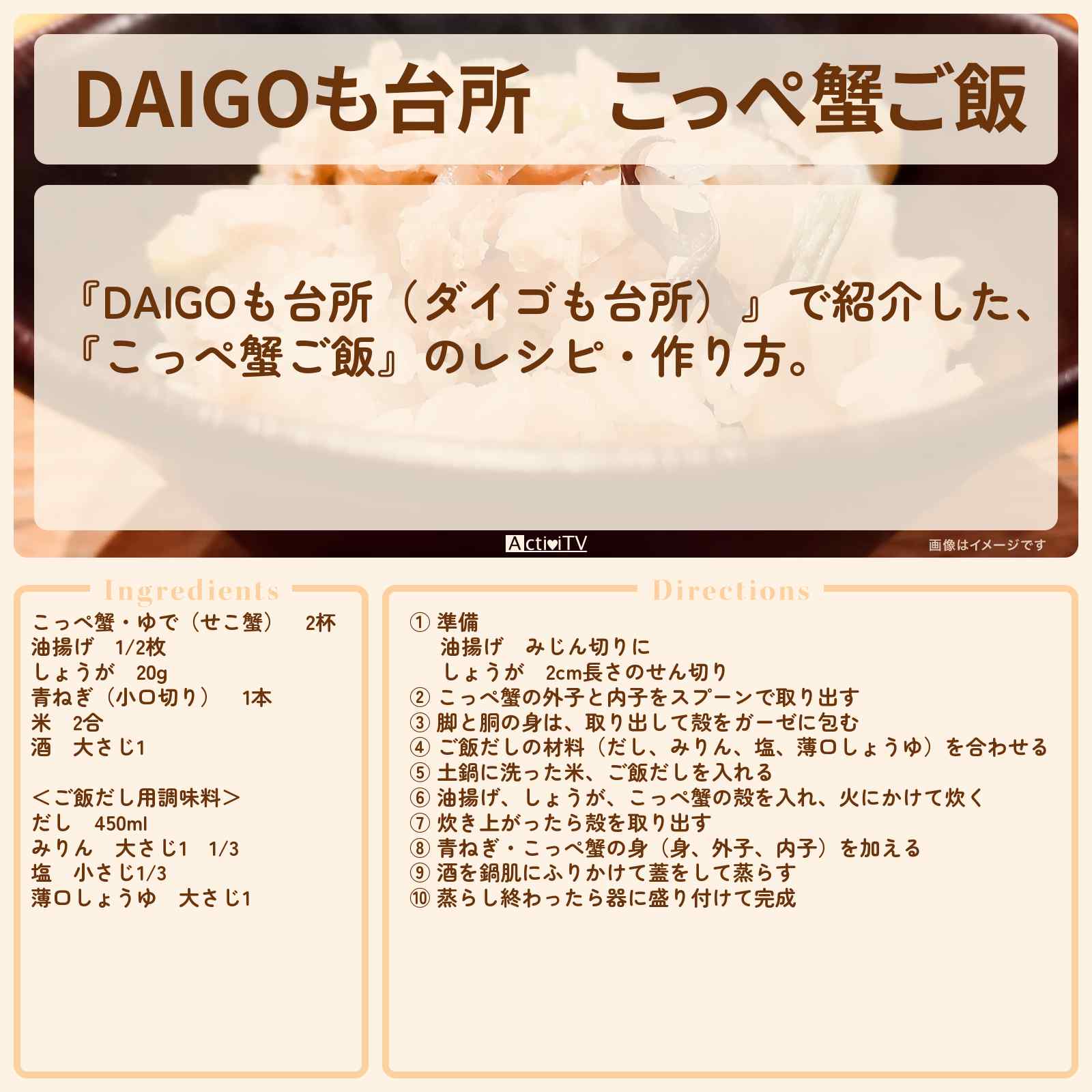放送の【DAIGOも台所(ダイゴも台所)】で紹介した、『こっぺ蟹ご飯』のレシピ・作り方。