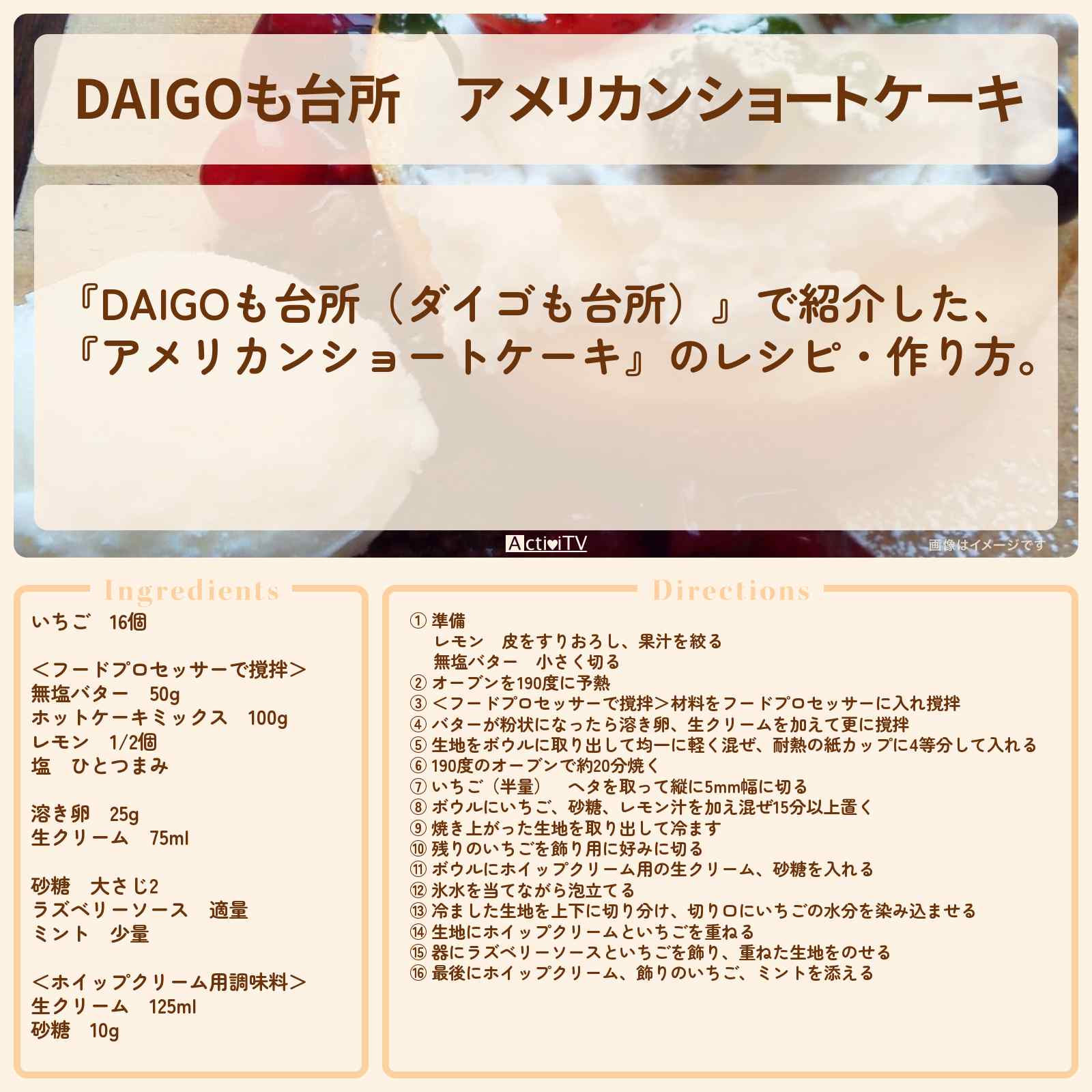 放送の【DAIGOも台所(ダイゴも台所)】で紹介した、『アメリカンショートケーキ』のレシピ・作り方。