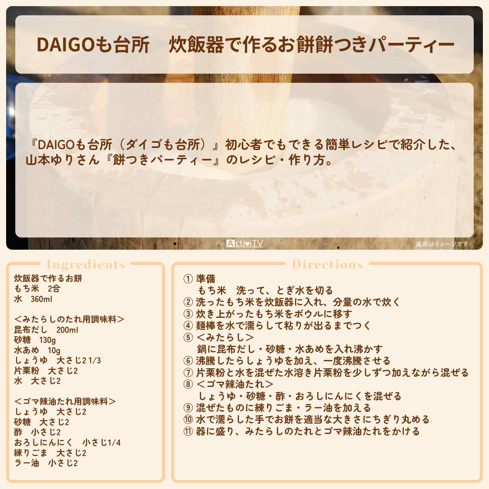 放送の【DAIGOも台所(ダイゴも台所)】初心者でもできる簡単レシピで紹介した、山本ゆりさん『餅つきパーティー』のレシピ・作り方。