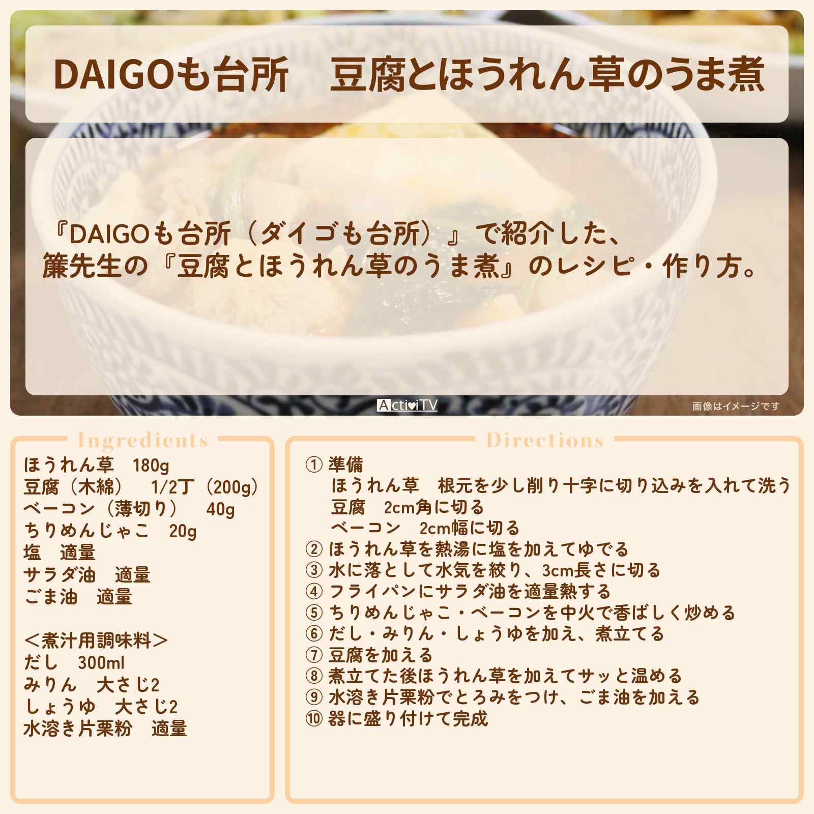放送の【DAIGOも台所(ダイゴも台所)】で紹介した、簾先生の『豆腐とほうれん草のうま煮』のレシピ・作り方。