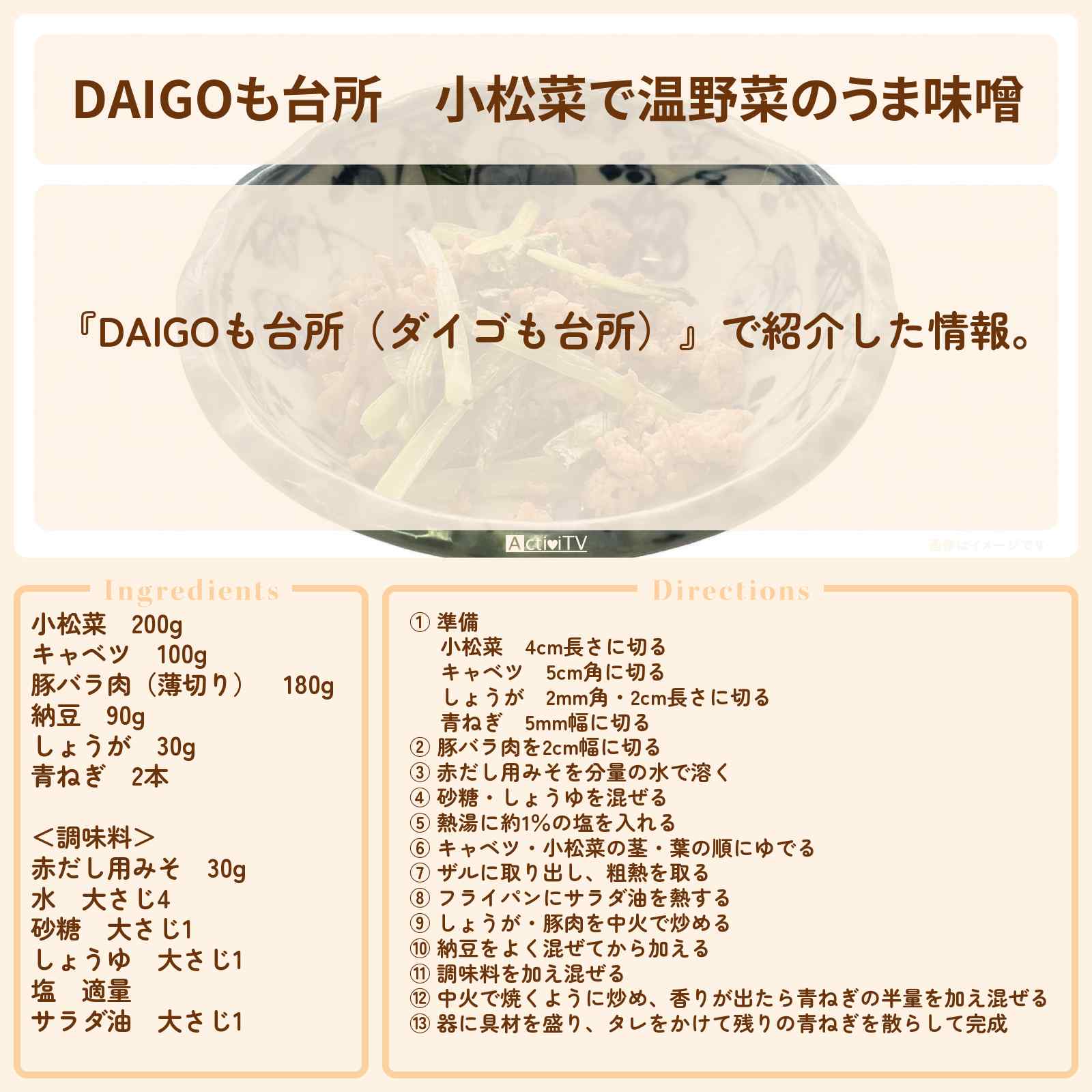 豚バラ肉、納豆を使った栄養たっぷりの一品です。味噌としょうゆの風味豊かなタレが、小松菜と豚肉の味を引き立て、さらに納豆の香ばしさがアクセントとなります。キャベツや小松菜など、手軽に手に入る材料で作れるのも魅力です