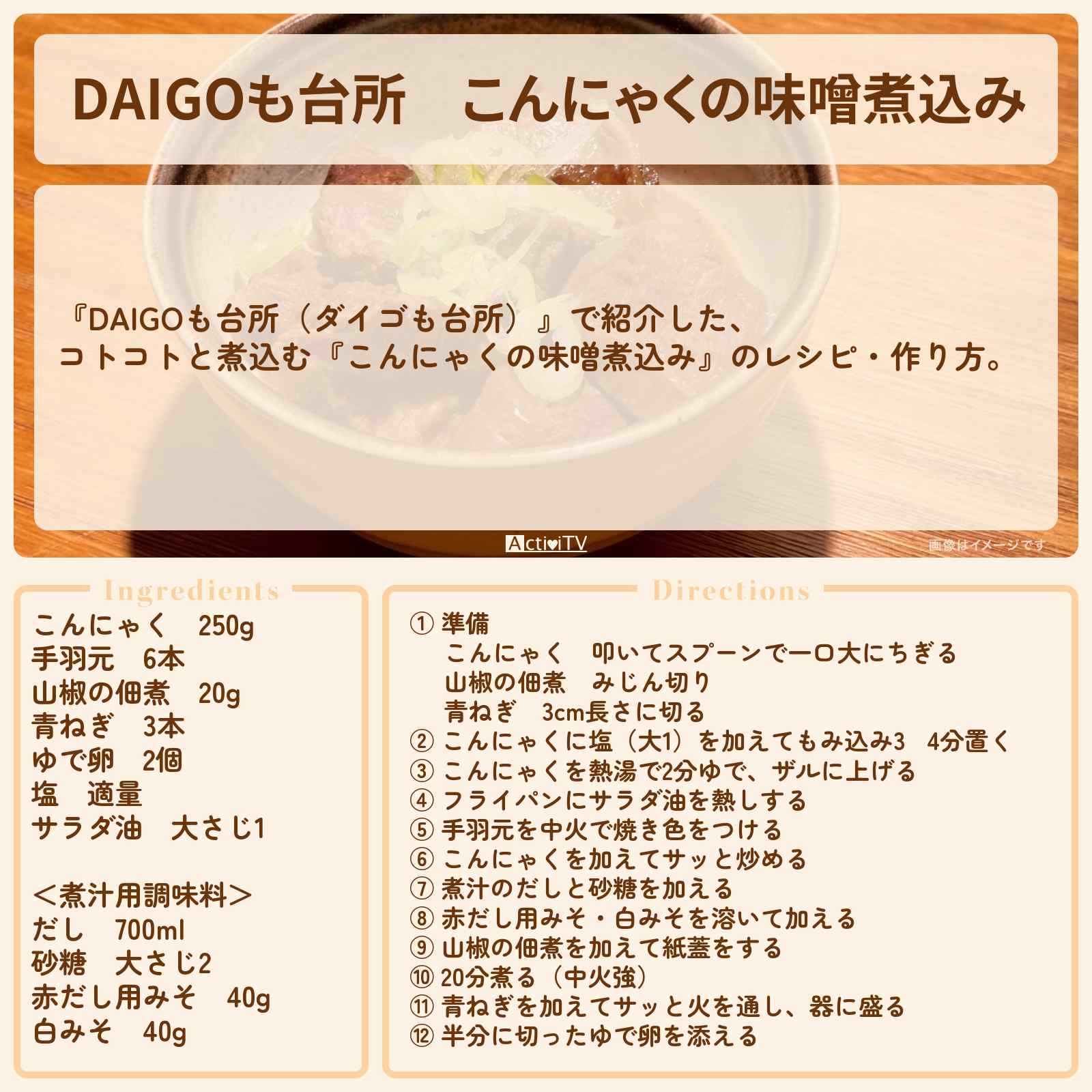 放送の【DAIGOも台所(ダイゴも台所)】で紹介した、コトコトと煮込む『こんにゃくの味噌煮込み』のレシピ・作り方。