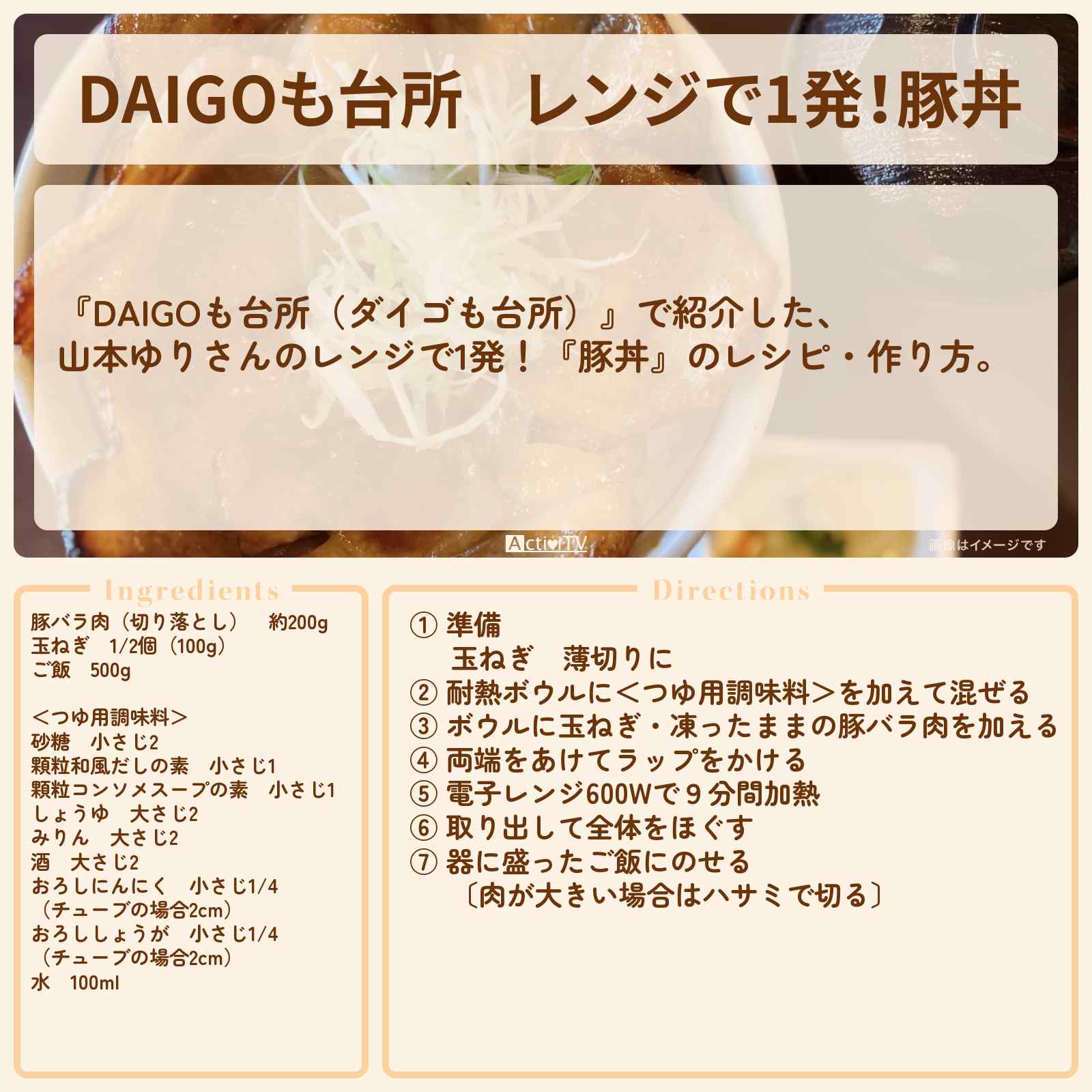 放送の【DAIGOも台所(ダイゴも台所)】で紹介した、山本ゆりさんのレンジで1発!『豚丼』のレシピ・作り方。