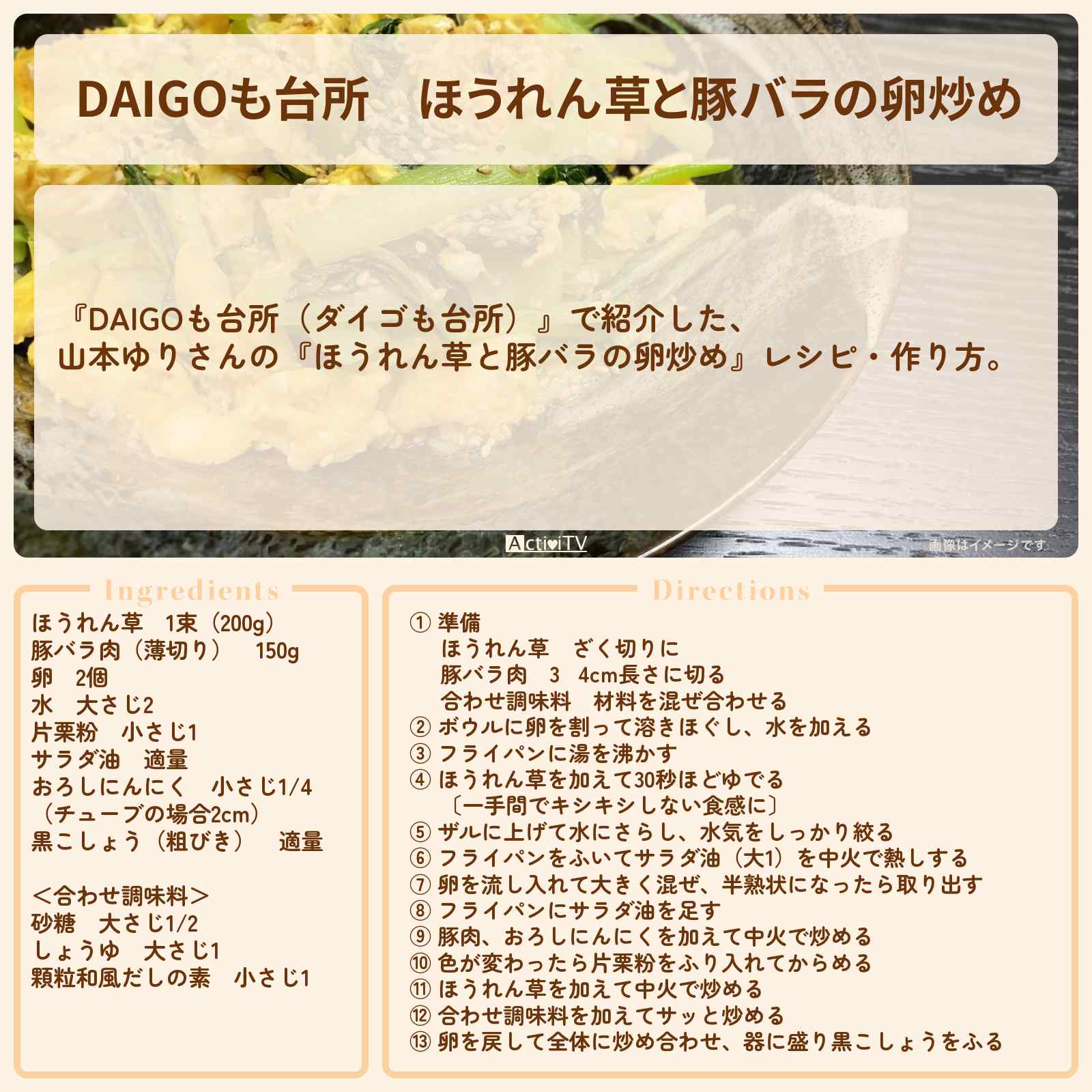 放送の【DAIGOも台所(ダイゴも台所)】で紹介した、山本ゆりさんの『ほうれん草と豚バラの卵炒め』レシピ・作り方。