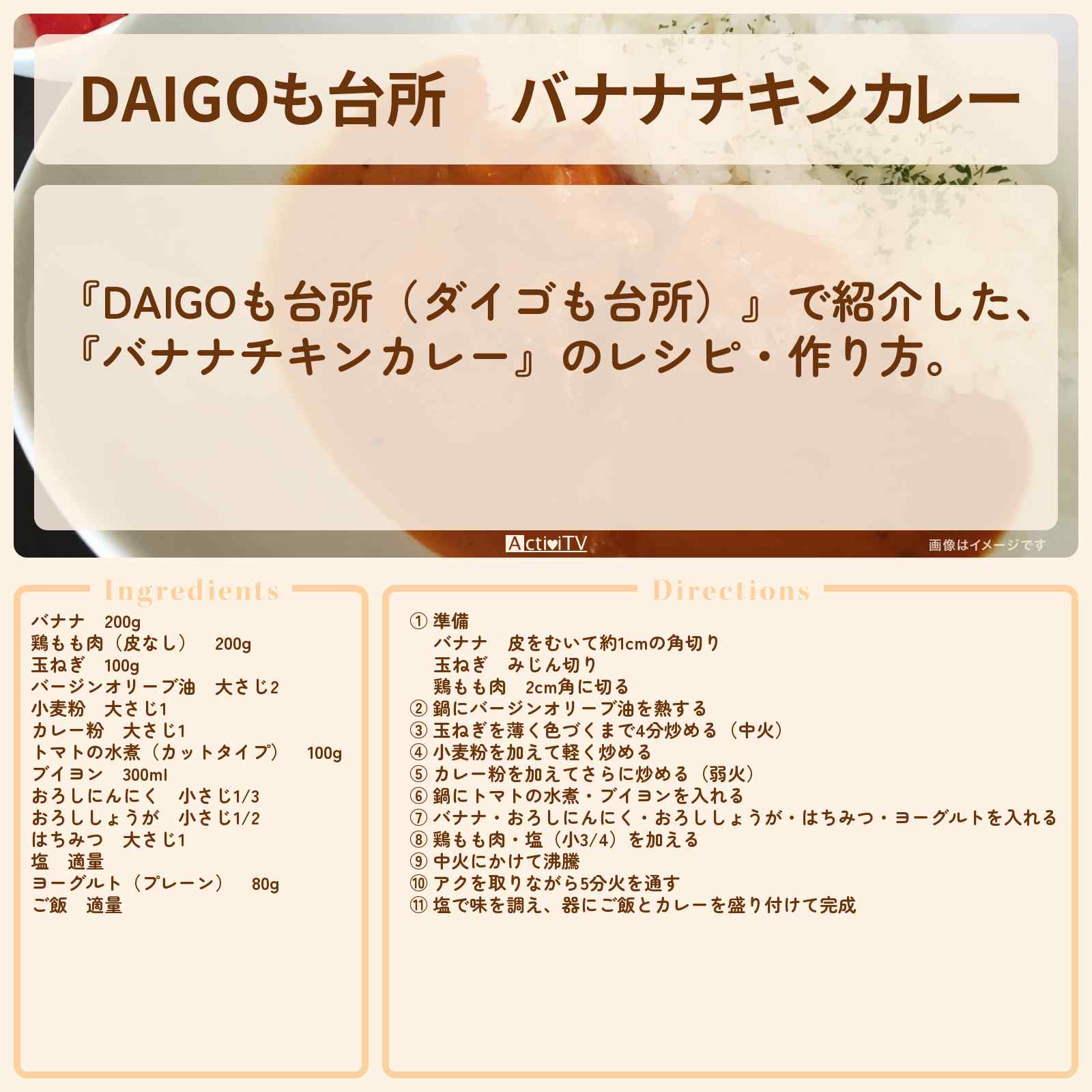 放送の【DAIGOも台所(ダイゴも台所)】で紹介した、『バナナチキンカレー』のレシピ・作り方。
