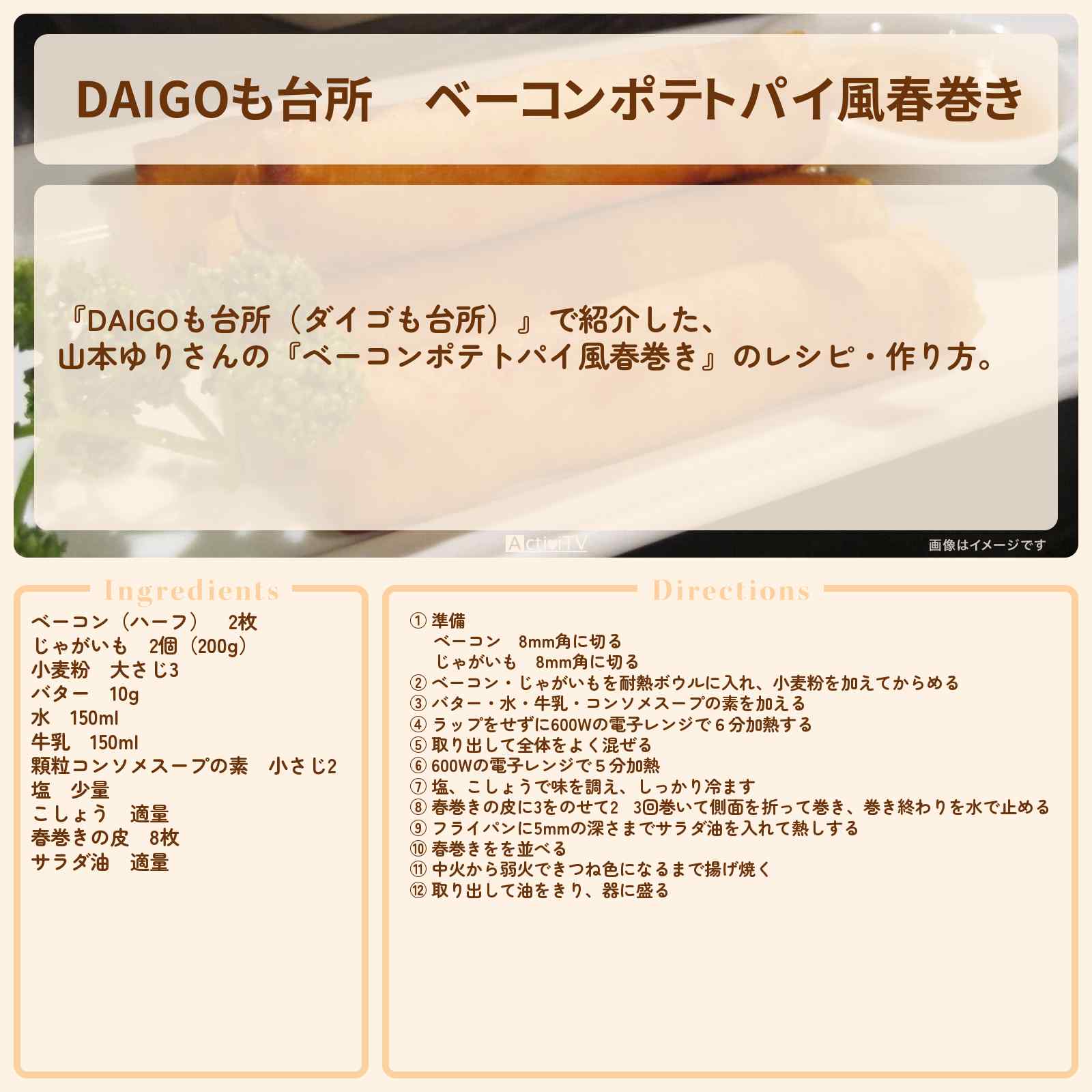 放送の【DAIGOも台所(ダイゴも台所)】で紹介した、山本ゆりさんの『ベーコンポテトパイ風春巻き』のレシピ・作り方。