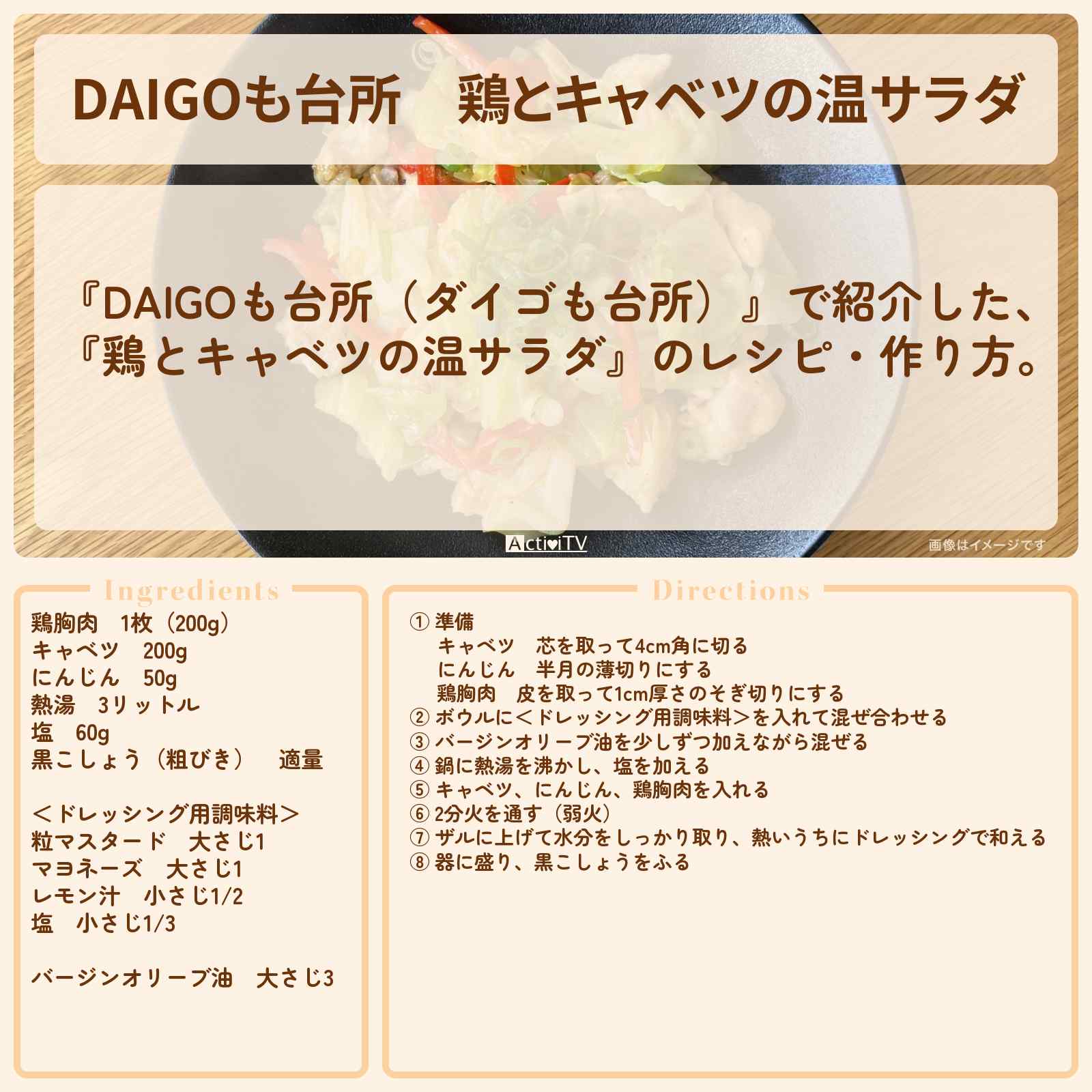 放送の【DAIGOも台所(ダイゴも台所)】で紹介した、『鶏とキャベツの温サラダ』のレシピ・作り方。