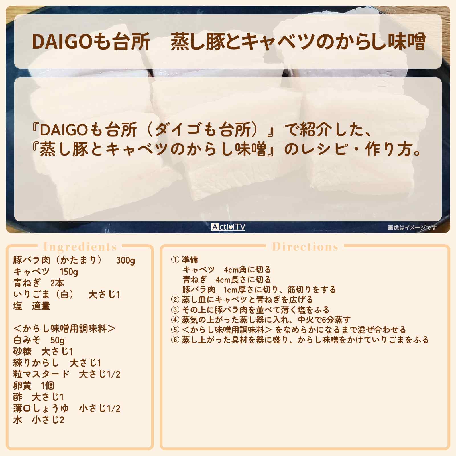 放送の【DAIGOも台所(ダイゴも台所)】で紹介した、『蒸し豚とキャベツのからし味噌』のレシピ・作り方。