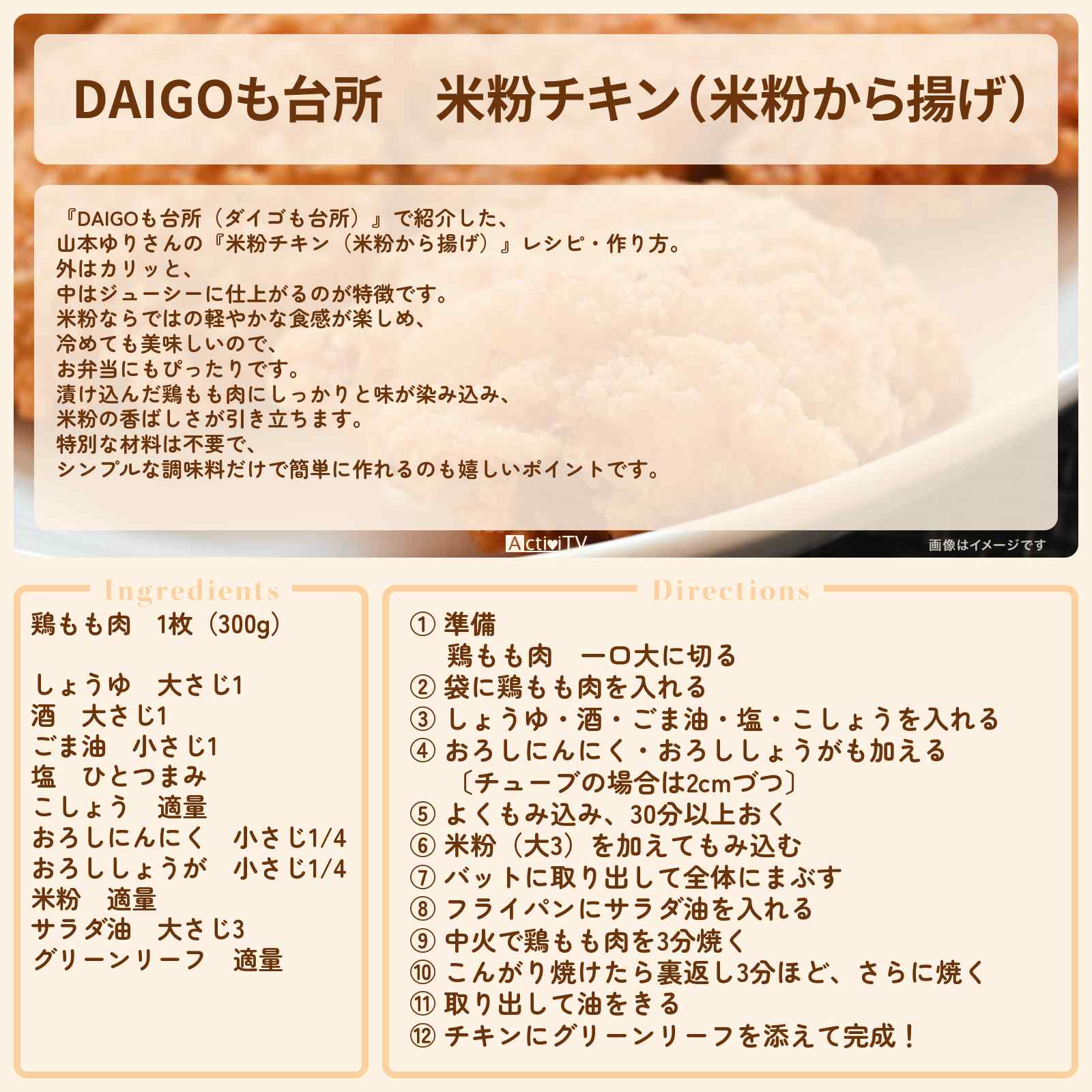 放送の【DAIGOも台所(ダイゴも台所)】で紹介した、山本ゆりさんの『米粉チキン(米粉から揚げ)』レシピ・作り方。外はカリッと、中はジューシーに仕上がるのが特徴です。米粉ならではの軽やかな食感が楽しめ、冷めても美味しいので、お弁当にもぴったりです。漬け込んだ鶏もも肉にしっかりと味が染み込み、米粉の香ばしさが引き立ちます。特別な材料は不要で、シンプルな調味料だけで簡単に作れるのも嬉しいポイントです。